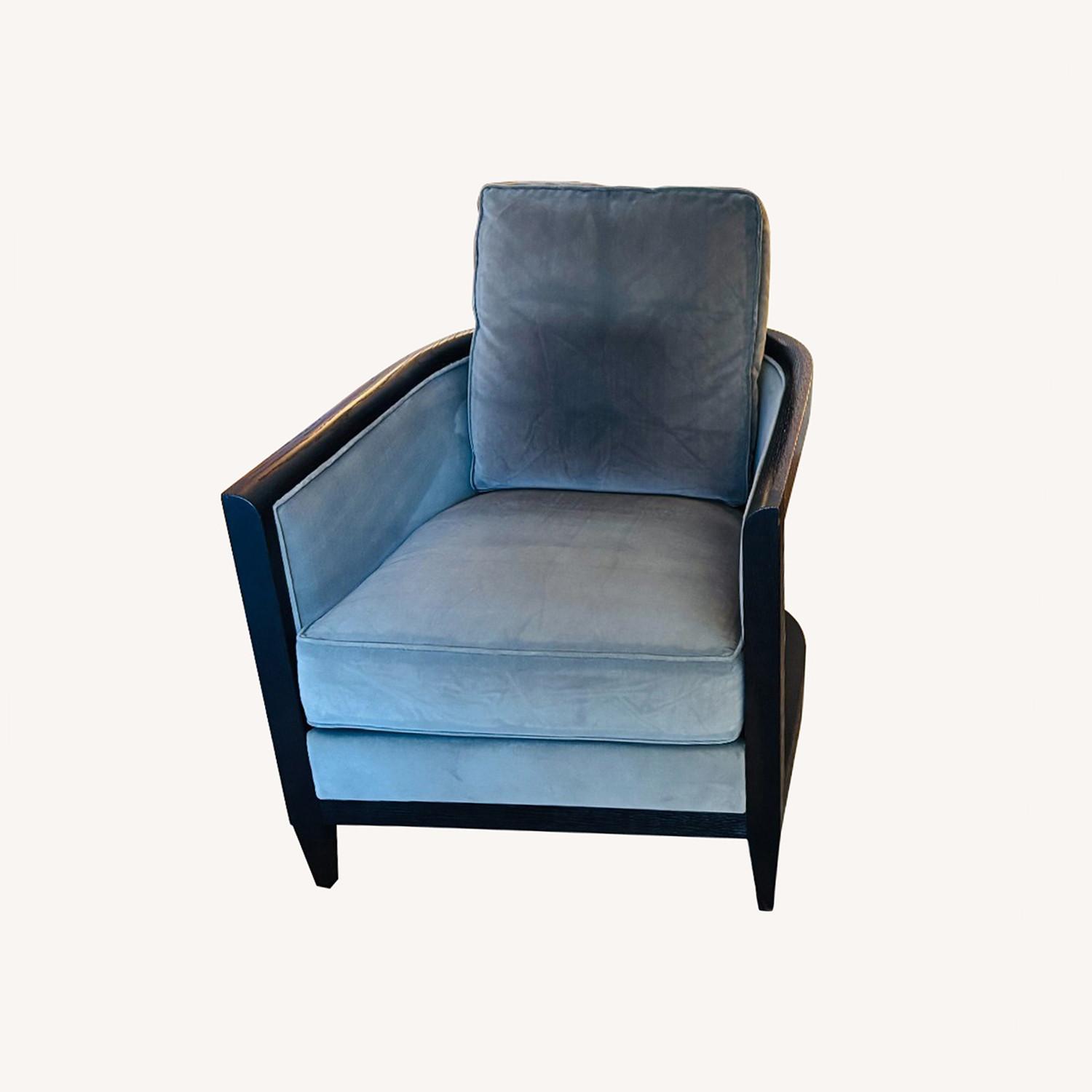 Seller's Notes:This is a pair of Velvet Club Chairs, designed by John Hutton for Holly Hunt. The listed price includes the pair of two chairs and two decorative velvet accent pillows as shown. The chair has an indulgent Art Deco silhouette that recalls the glamour of Hollywood Regency. The exposed wood frame is cerused and finished black (with dark brown undertone) stained oak, and these examples have thick luxurious gray velvet fabric upholstery. The box cushions on the seat and back are substantial, allowing for maximum comfort while remaining tailored in form. The quality and workmanship of Holly Hunt pieces is outstanding, with no stitch or detail overlooked. Each chair measures 33 inches deep, 27.5 inches wide, and 33 inches high. They have a seat height of 19 inches and a seat depth of 26 inches. Seat Interior Width 17.0 inches, Arm Height 25.0 inches, Seat Interior Depth 26.0 inches. Overall, these chairs are in excellent condition with only minor signs of fading from light exposure. The box cushions show light fading/creasing. There are some minor scuffs on the legs and the arms. As is visible in the photos with removed box cushions, there is fading of the original gray color of the velvet , but this is covered by the box cushions (see photos with John Hutton label/box cushion removed) . There is a small pulling/tear at a velvet seam in the inside back of one chair, visible only when box cushion removed- covered by the cushion itself . The chairs were purchased via an interior designer in 2009 but never used- the chairs were in storage, unused since their purchase in 2009 .