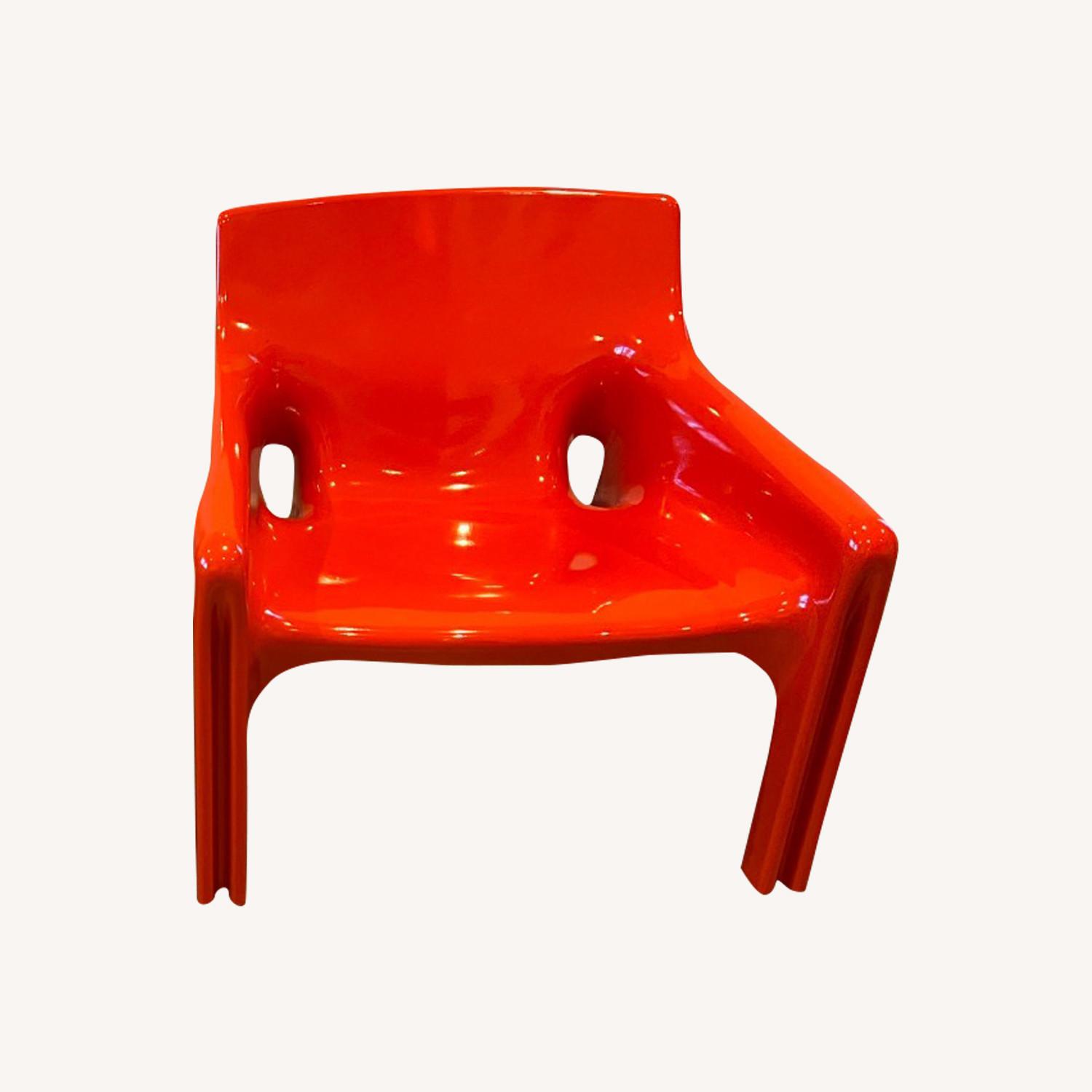 Seller's Notes:Manufactured by Artemide. Pair of red plastic Vico Magistretti Vicarioi lounge chair with squared backrests, curvilinear forms and brand stamps molded at undersides. Made in Italy. Excellent condition.