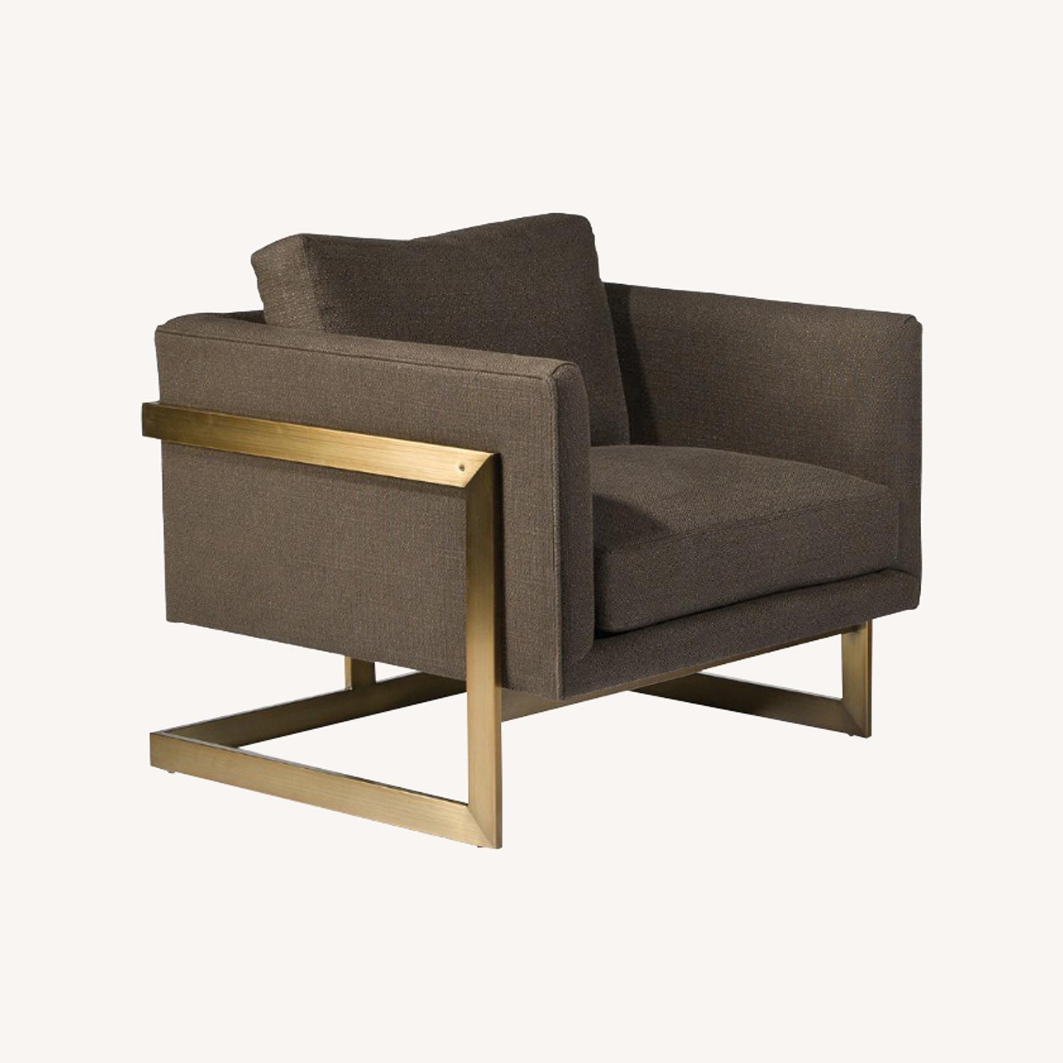 Seller's Notes:These are stylish designer club chairs that sat in my office for a year but I have redesigned my office. Here is the description from the thayer coggin that retail for $4500. Here is website descriptio and website link https://www.thayercoggin.com/products/design-classic-989-lounge-chair-bronze Originally designed in 1968 by Milo Baughman, the 989 is a timeless classic of the modern era. This visually arresting chair features an upholstered cube that seems to float inside an angular, flat-bar metal frame. With its inviting thick, loose cushions, the 989 lounge chair combines big comfort with glamorous profiles from all angles. The 989 is affectionately known as the “T-back” chair, as its exposed metal frame forms a "T" when viewed from the rear. Steel frame available in brushed bronze (No. 989-103-B), polished stainless steel (No. 989-103), satin brass (No. 989-103-SB), powder coat black (No. 989-103-BPC), white powder coat (No. 989-103-WPC), gray powder coat (No. 989-103-GPC) chocolate bronze powder coat (No. 989-103-CBPC), or sandblast bronze (No. 989-103-BX) metal finish. Select from any of our in-house curated fabrics or leathers for upholstery.