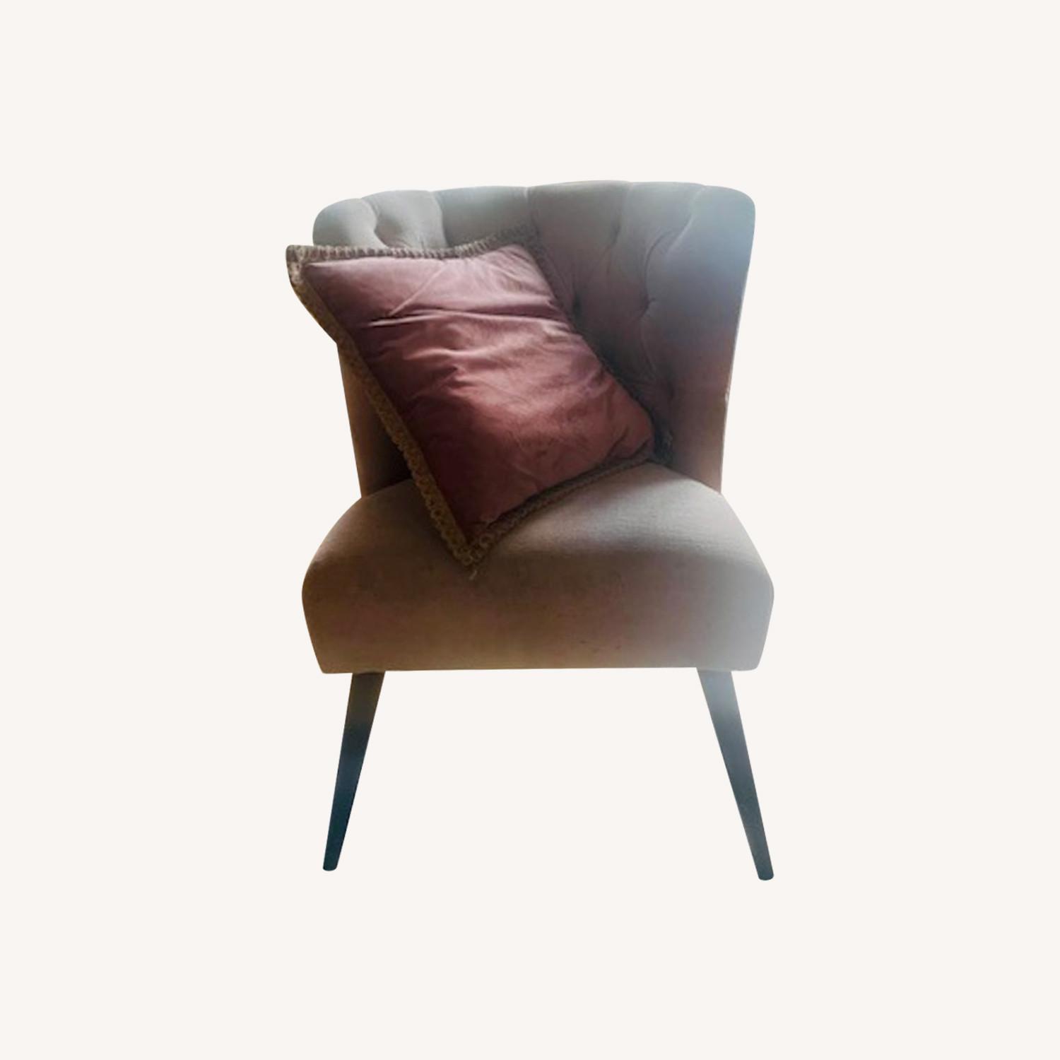 Seller's Notes:pale pink tufted chair and suede pillow in fair condition with some wear and tear but can be refurbished and cleaned easily.