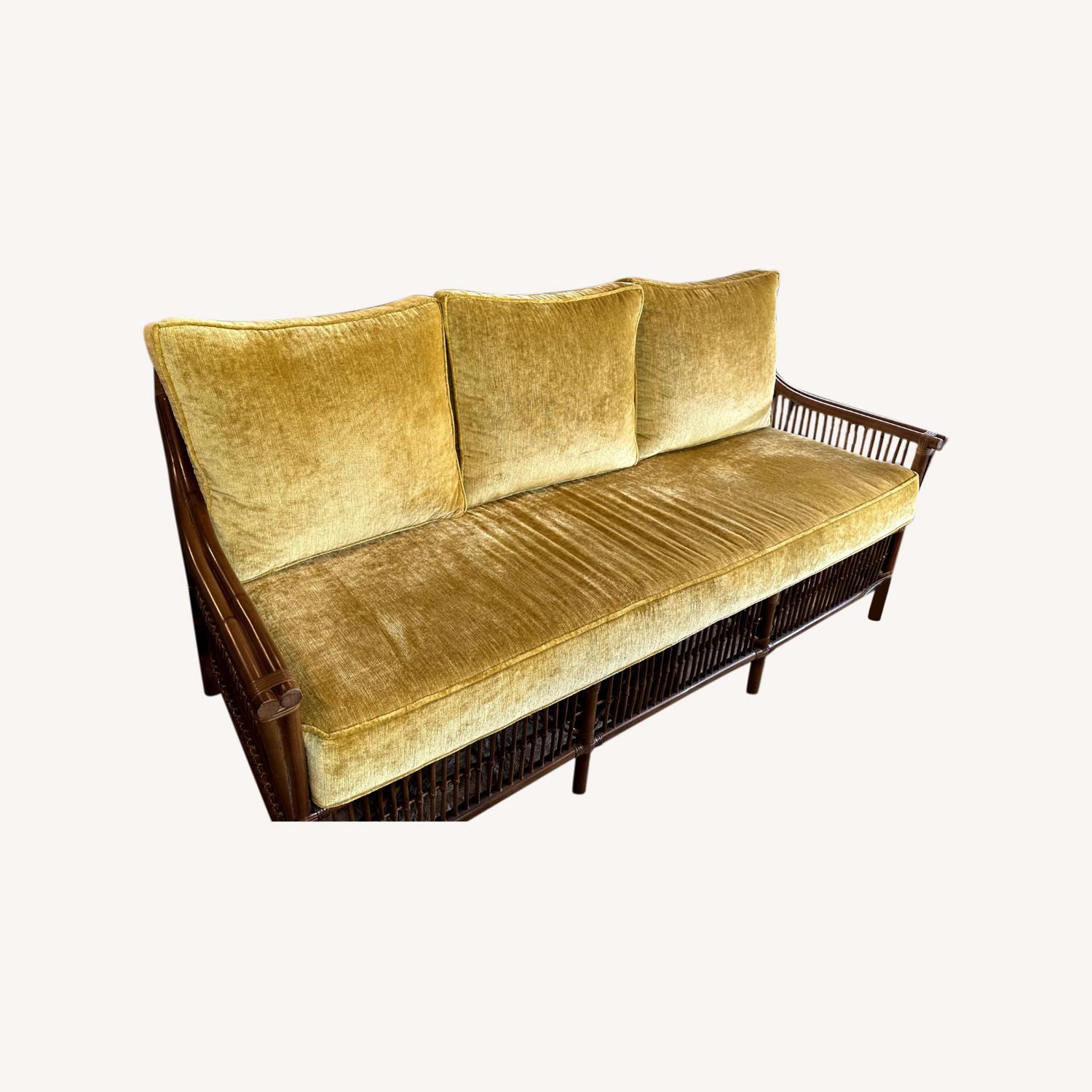Seller's Notes:This sofa brings the classic look of rattan poles intricately positioned by hand to draw the natural extension for your inner space. Reupholstered in a cheerful golden yellow fabric. Comfortable cushions are included. If you want to bring the casual, relaxed feel of upscale tropical homes right to your living area or sunroom, look no further