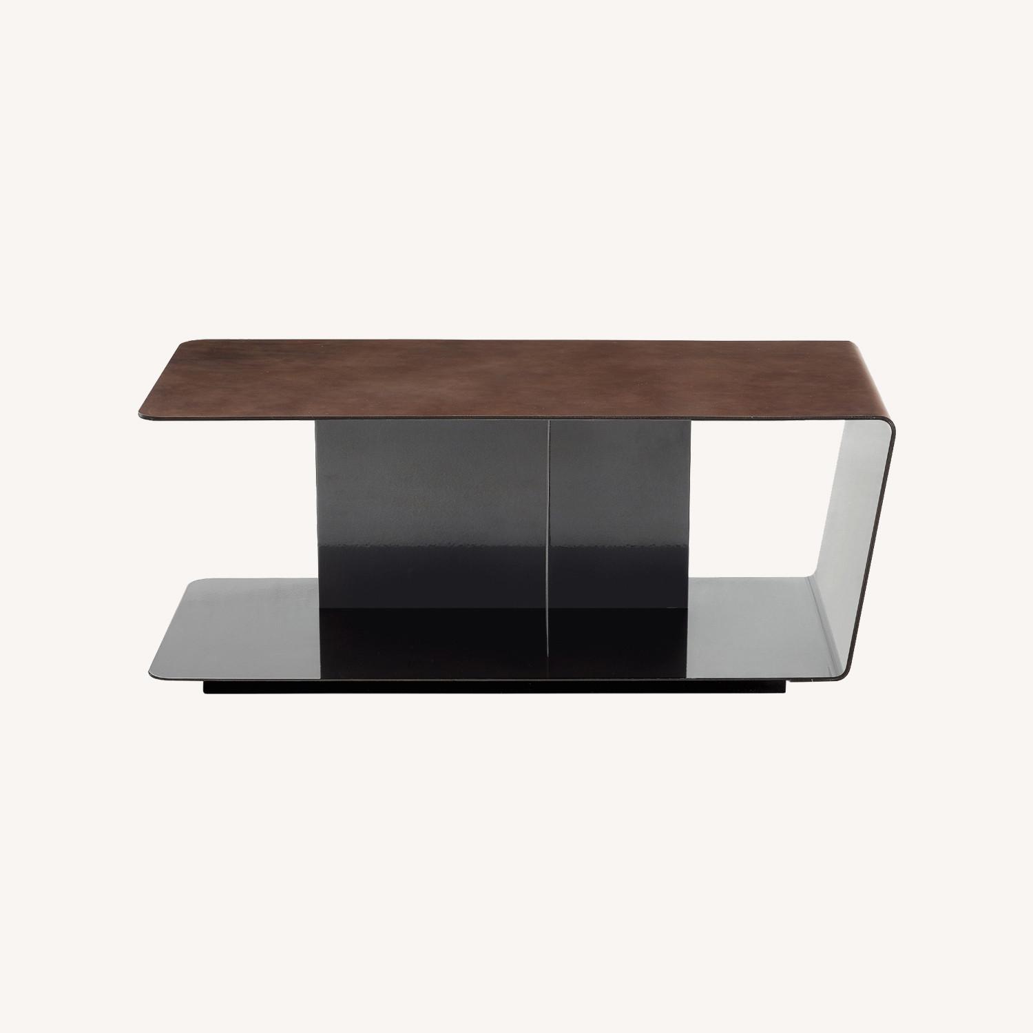 Seller's Notes:This coffee table is part of the Paris Seoul collection by Italian brand Poliform. With metal structure and external leather covering, it can be placed next to sofas and armchairs to keep everything you need at your fingertips adding elegance and sophistication to any interior. It features a spacious storage that can be used for objects and/or as a bookcase. The metal structure is made of solid steel powder coated in a matte black/bronze finish. The surface is covered with dark brown leather adding some contrast to the metal base while preserving a coherent and elegant look. The overall design is enhanced by the inclined side which also covered by leather. It's a stunning piece designed by renewed French designer Jean-Marie Massaud and fabricated by hand in Italy.