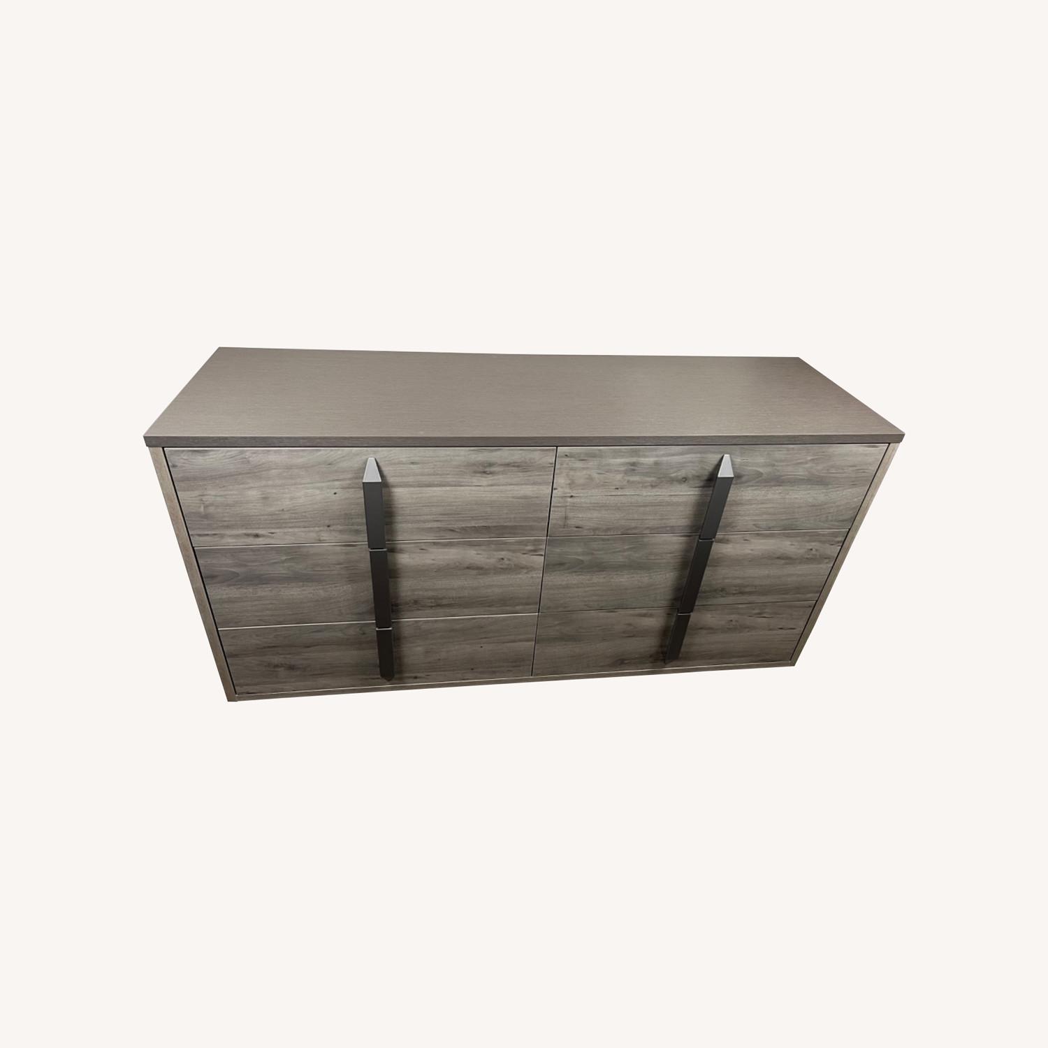 Seller's Notes:Clean lines give this snappy dresser modern appeal in addition to its six soft close drawers providing spacious storage. With a high gloss lacquer gray wood grain finish and hallmark vertical hardware pulls of contrasting faux metal, this dresser makes a statement in any bedroom. Made in Italy.