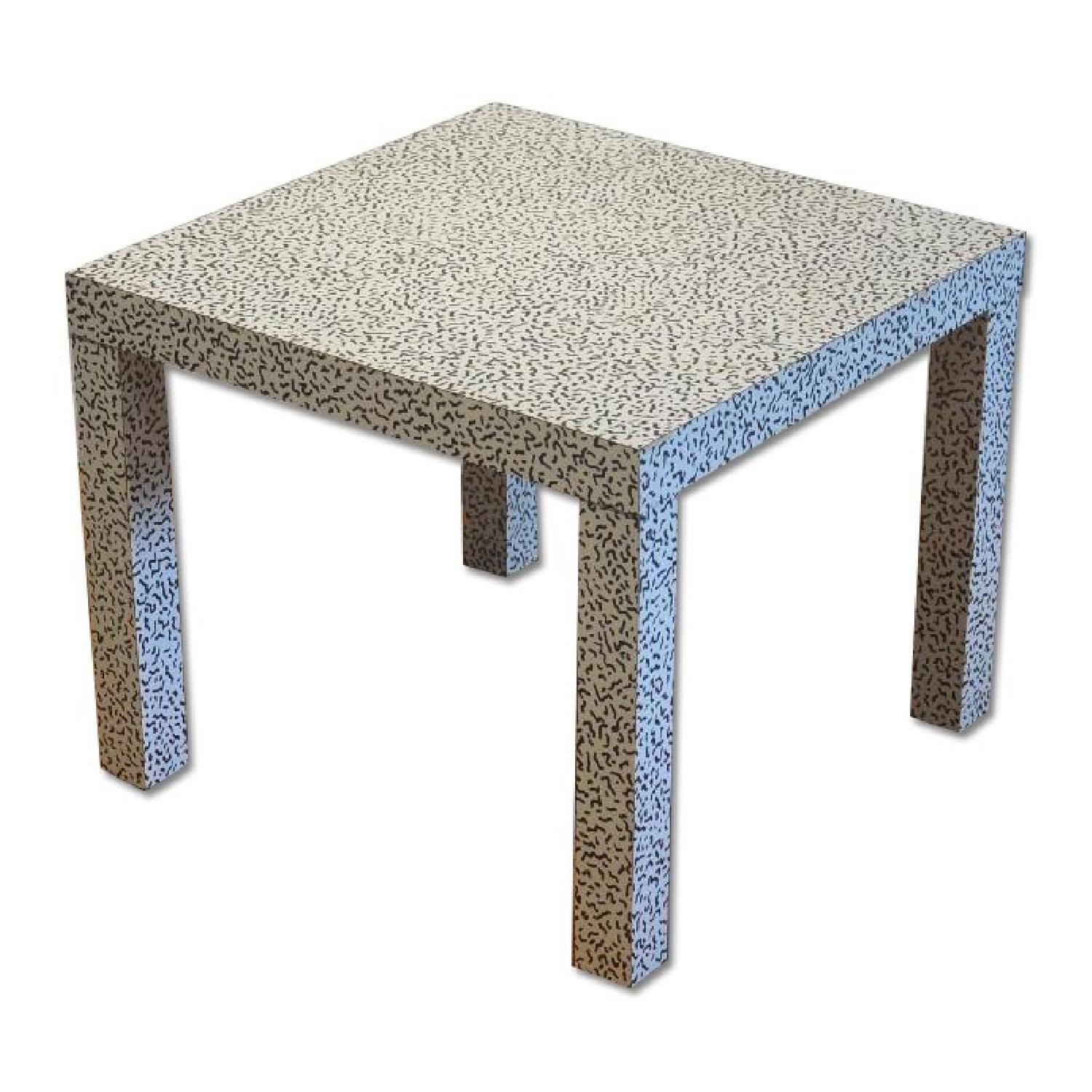 Seller's Notes:These are parsons tables with the Ettore Sottsass bacterio print laminate. These are from Italy, and were apparently used in a memphis milano exhibition.