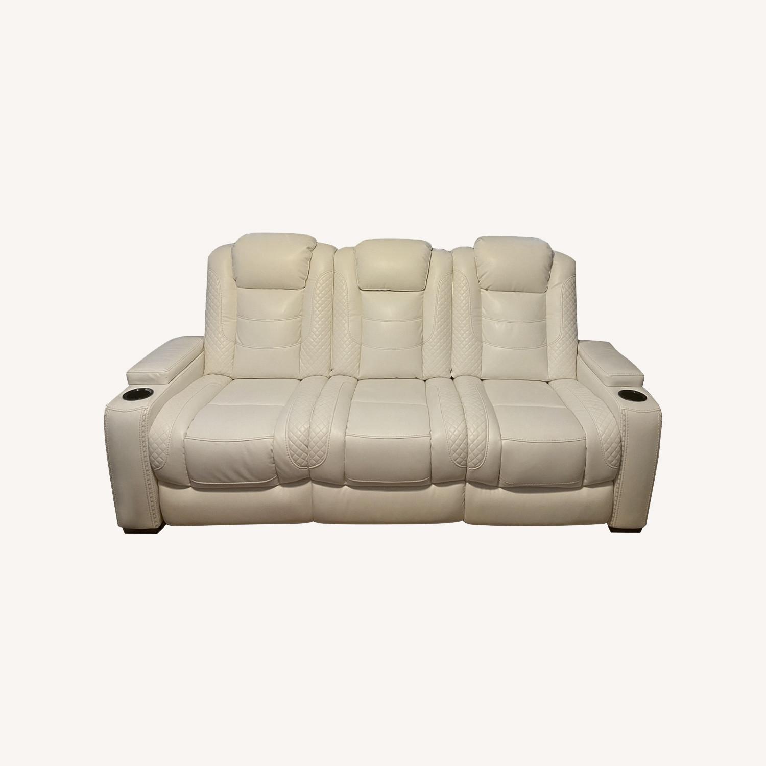 Seller's Notes:The Party Time power reclining sofa takes its cue from luxury automobiles with lattice and crosshatch stitching, for a richly tailored aesthetic that gives you plenty of reasons to celebrate. Sumptuously padded cushions and crisp white faux leather upholstery add to the indulgence. When it’s time to rev up the action, the dual reclining bucket seats (middle seat is stationary), Easy View™ power adjustable headrests and a center seat that folds down into a table keep you in the driver’s seat.