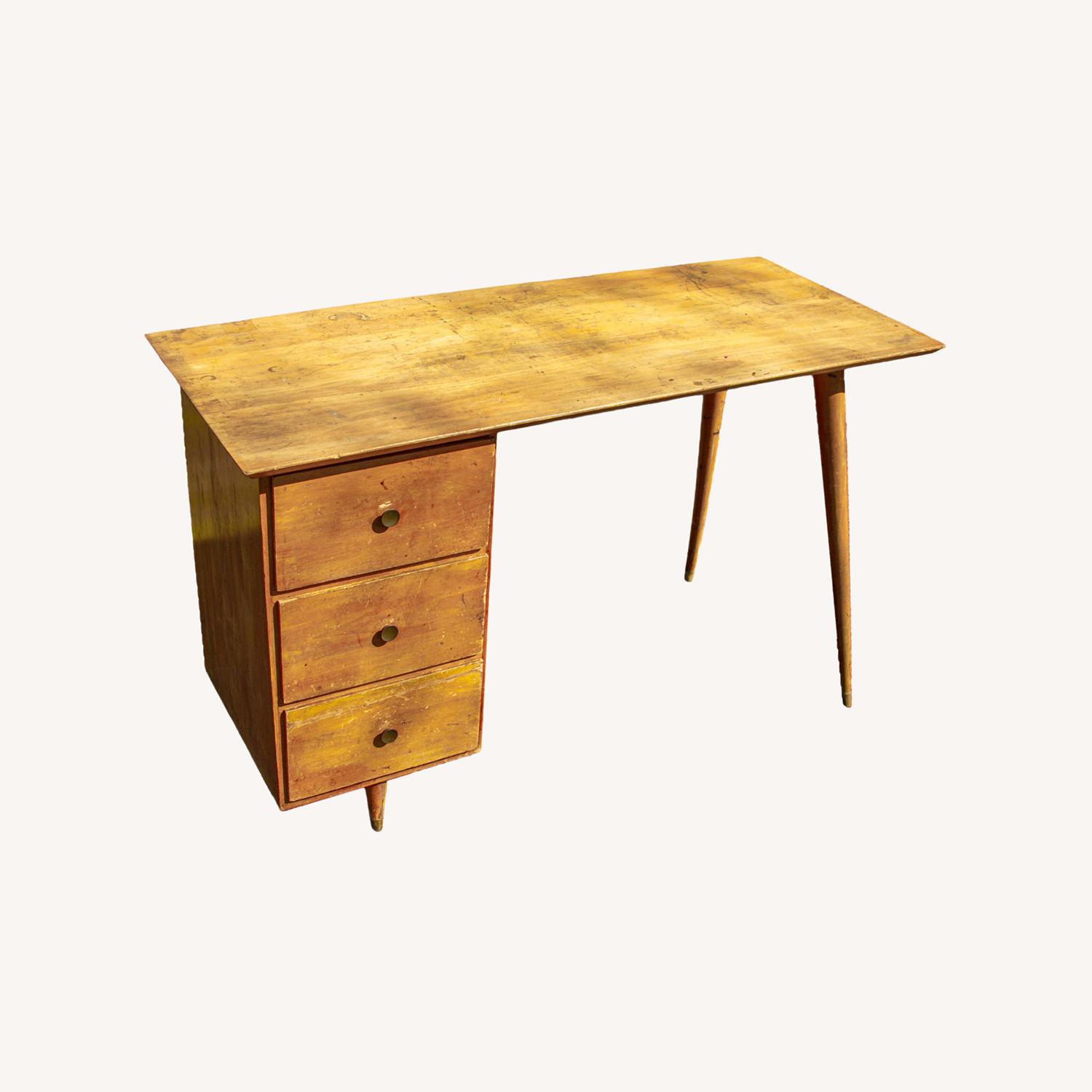 Seller's Notes:A Mid Century collectors item from Paul McCobb, this Planer Group Desk sports a unique three drawer configuration. Table is sturdy but does need restoration work to bring it to its full potential. No major cracks but many surface stains and scratches. Three of the four legs are missing the metal foot protectors.