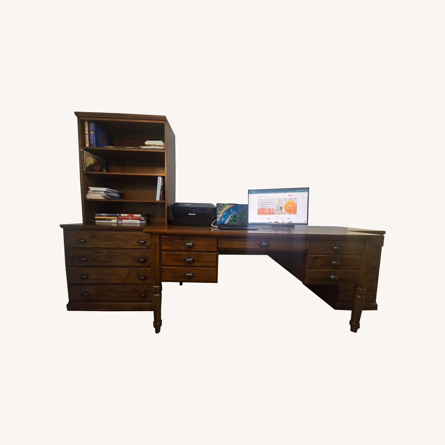 Create a timeless and functional workspace with this elegant 3-piece office set from Pottery Barn’s Printer’s Collection, finished in warm Tuscan Chestnut. Originally purchased for over $4,300 (including tax and delivery), this set blends classic design with serious storage and utility.