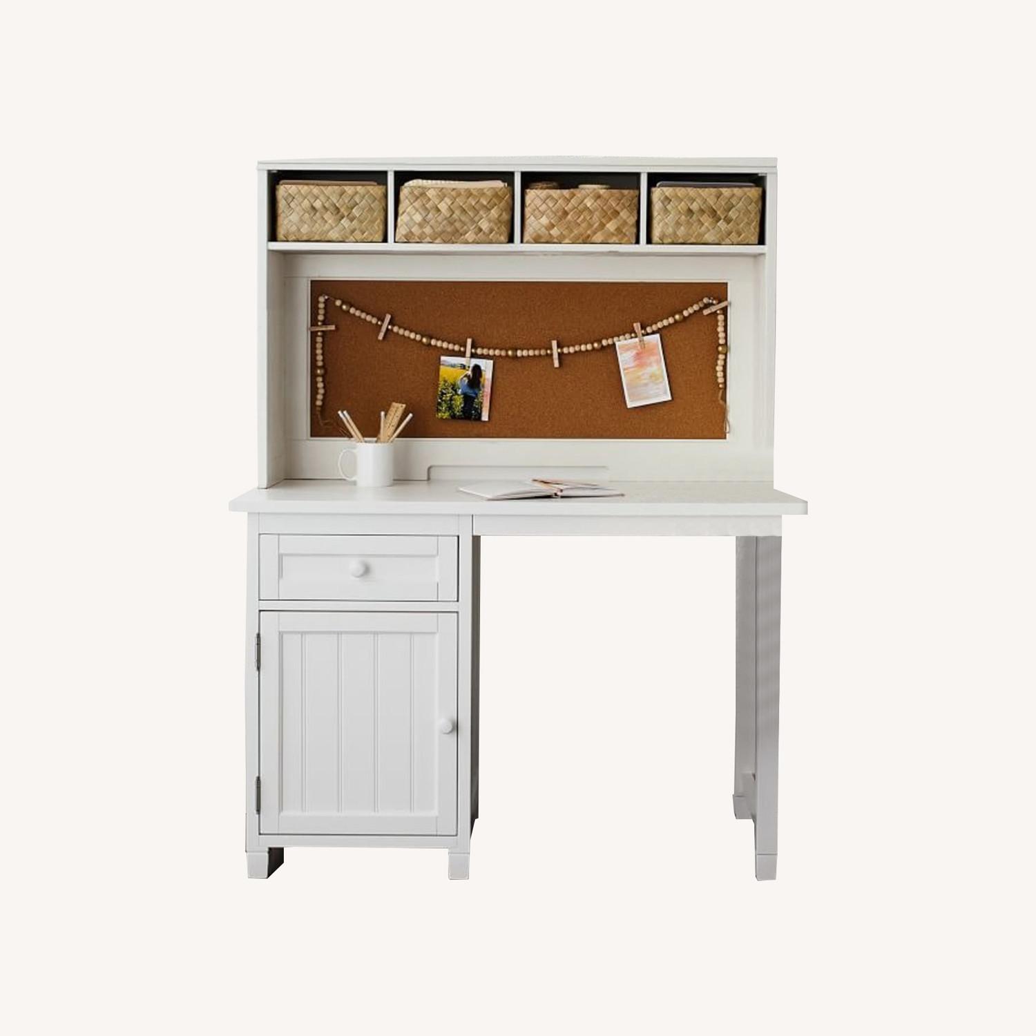 Seller's Notes:This PBTeen Beadboard desk + smart hutch is great for schoolwork and storage! It's only 5 years old, but we're redesigning the room it's in. We are actually selling the other furniture in the set - including the armoire/chiffonier and daybed with trundle, so look for those, too! According to the PB Teen website : "Maximize your space with this compact desk and hutch set. Efficient and functional, the roomy hutch includes four cubbies and a cork board surface. The desk has a cabinet, fixed shelf and drawer for easy storage. - GREENGUARD Gold Certified. This low-emitting product has been tested for more than 10,000 chemicals and VOCs to contribute to cleaner indoor air. - Made in a Fair Trade Certified™ factory, supporting fair and safe labor practices and empowering workers to invest in their communities. Workers receive extra funds for every product sold which are used for community projects chosen by workers. - Crafted from solid pine, MDF, premium-quality plywood and anigre wood veneers. - Space-saving hutch features a corkboard for notes and reminders as well as four cubbies which fit PB Teen storage bins. Desk drawer and cabinet unit can be positioned on left or right side of desk; the cabinet unit is currently on the right side. Desk and Hutch Set • Overall: 44" wide x 20" deep x 58.5" high Desk • Overall: 44" wide x 20" deep x 30.5" high • Pedestal Only: 18.5" wide x 18" deep x 29.5" high • Drawer Interior: 14.5" wide x 15.5" deep x 4" high • Cabinet Interior: 15" wide x 16" deep x 18" high • Legroom: 23" wide x 18" deep x 27.5" high Hutch • Overall: 43.5" wide x 8.5" deep x 28" high • Bottom Interior: 41.5" wide x 9" deep x 20" high • Cork Board: 39" wide x 14.5" high • Cord Slot: 16" wide x 1" high • Cubby (4): 10" wide x 9.5" deep x 6" high • Weight: 37.5 pounds
