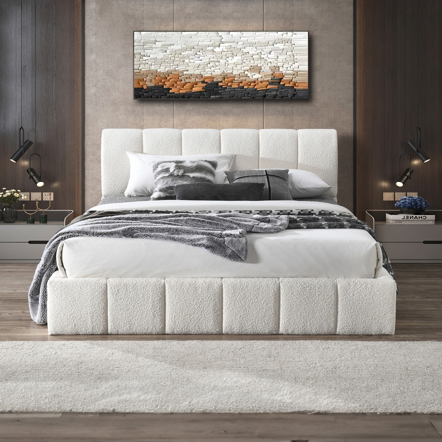 Seller's Notes:Pearce mid century modern teddy boucle fabric, channel tufted platform bed. Its trendy design with sturdy and durable wooden slat and center support system can be used for mattress size or type; no-box spring needed.