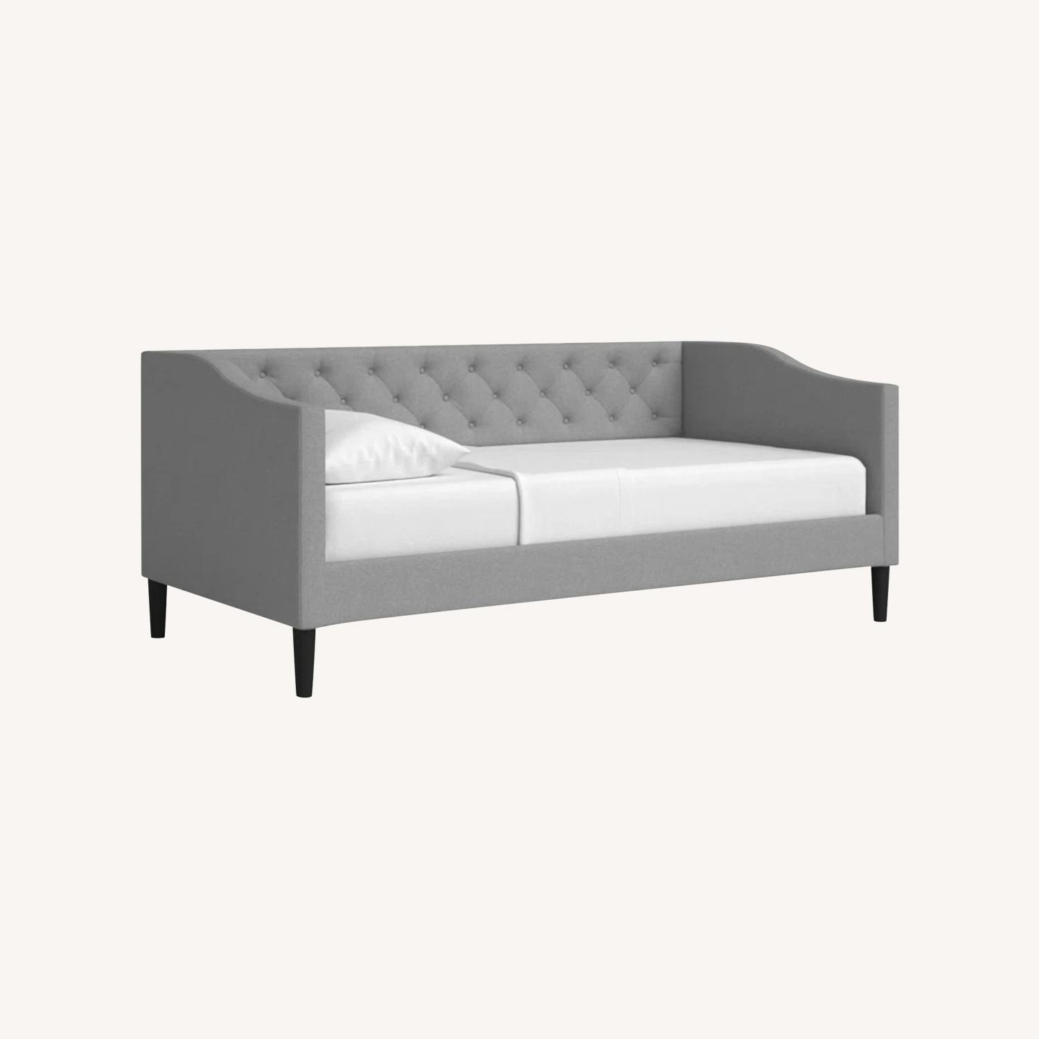 This daybed gives you another spot in your home for you or your guests to stretch out, relax, and have a snooze. It features a clean-lined classic silhouette that includes sloped arms for a traditional look. Plus, it has a solid and engineered wood frame that rests on tapered dowel legs for a modern touch. Wrapped in gray-hued polyester fabric, this bed comes with a slat system that supports a twin-sized mattress (sold separately). Button tufting with diamond stitching completes the design.