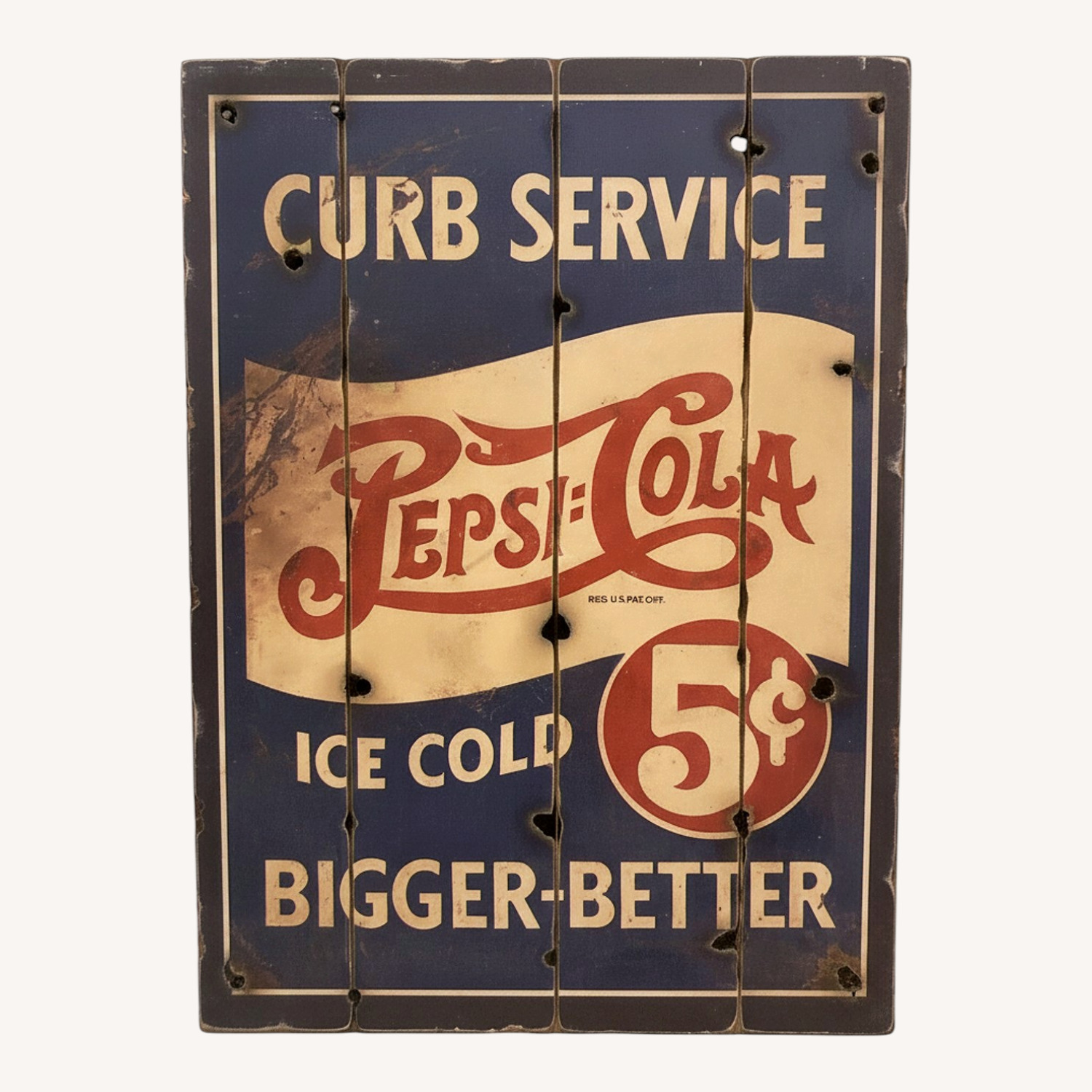 Seller's Notes:Retro-style Pepsi-Cola wall sign. Distressed finish. Great condition. Printed on plank-style wood panels for a vintage Americana look.