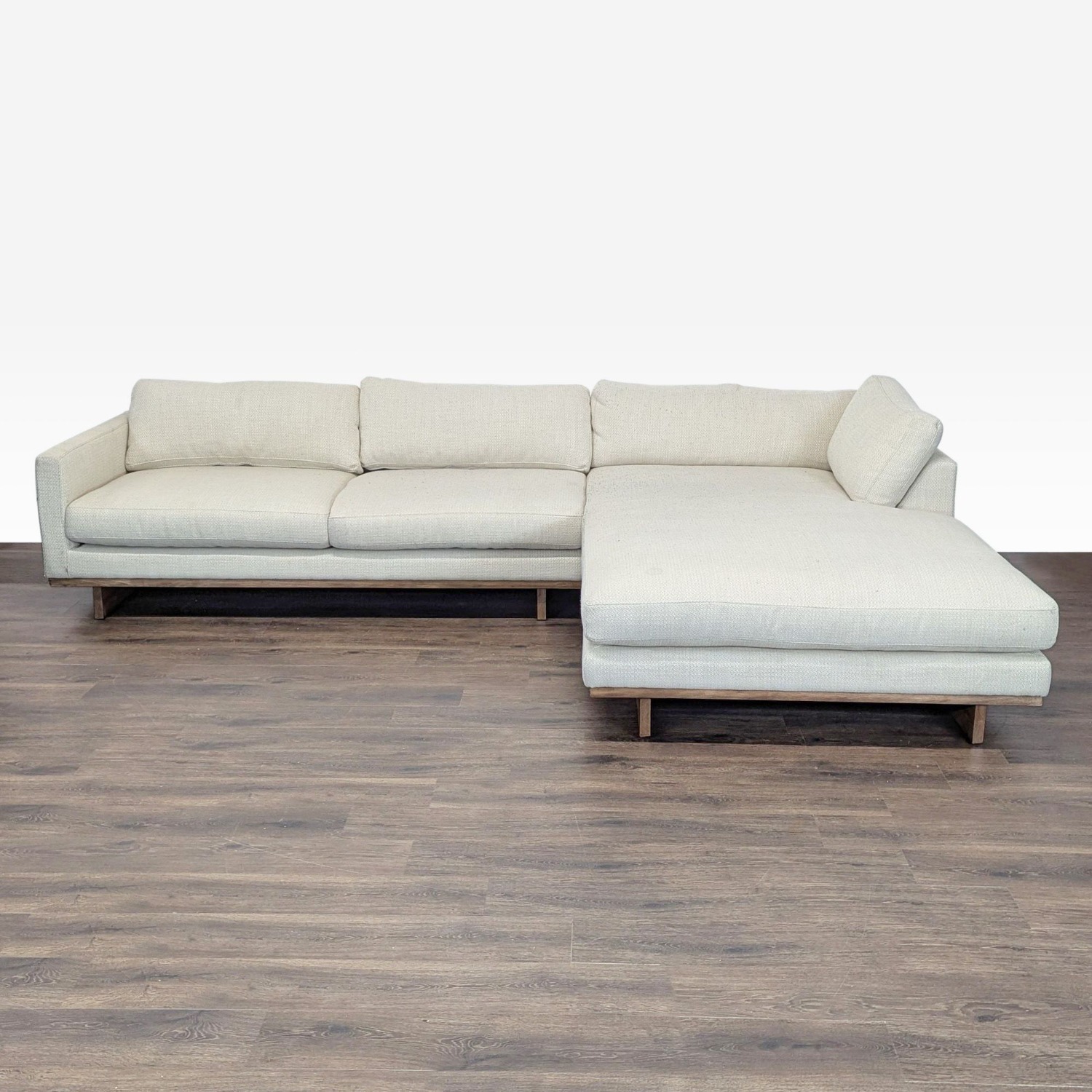 Seller's Notes:This stylish sectional features a light beige fabric and a spacious chaise, perfect for relaxing or entertaining guests. The clean lines and wooden base give it a modern look that fits any living room. Comfortable cushions provide plenty of support for everyday use. Great for family rooms or apartments.