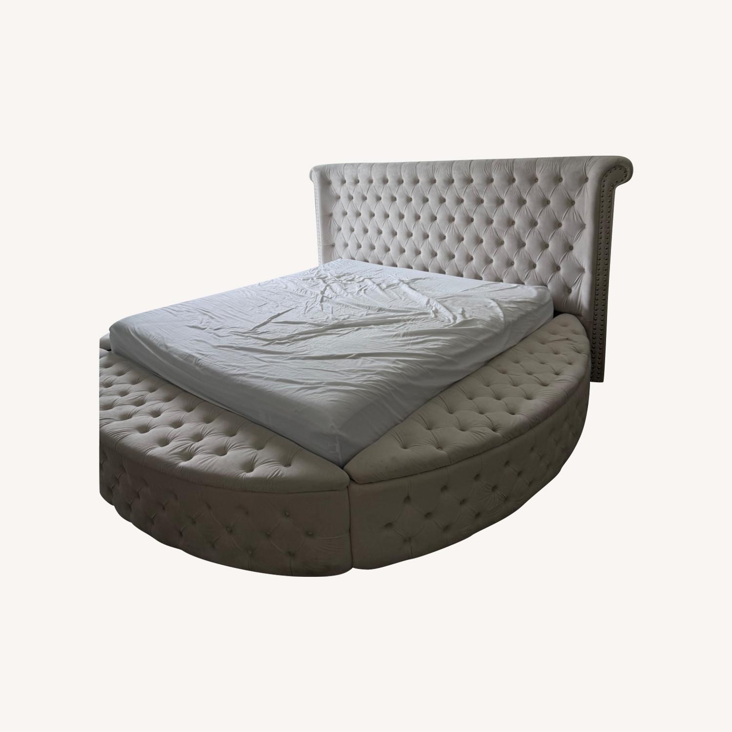 Seller's Notes:Modernize your bedroom with the Upholstered Round Storage Bed. With its lavish movie star contemporary design, this centerpiece adds excitement to your bedroom décor. Crafted with metal framework, wood slates and premium foam padded, and deep button tufted velvet upholstery throughout in a round-shape silhouette. Storage side-ottomans on three sides offer convenient storage space as it adds to the look. The nail-head trim design of the upholstered headboard brings an artistic atmosphere to your bedroom. Assembly required.