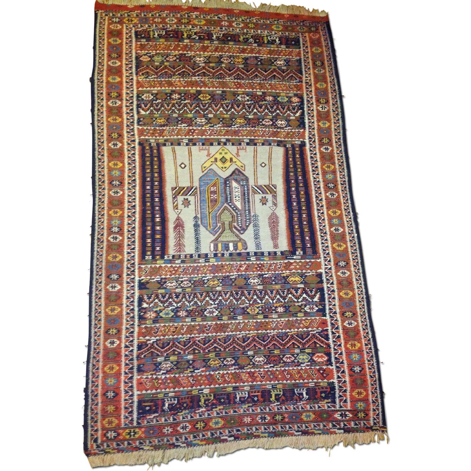 Seller's Notes:Beautiful colorful Persian kilim .Made with 100% natural wool and Cotton, vegetable dyed and knotted by hand. Good condition--no holes, rips. It purchased from Iran. Approximate measurements are 43" x 78". I've done my best to picture it in detail and describe everything, but if you have any additional questions, I will respond promptly.