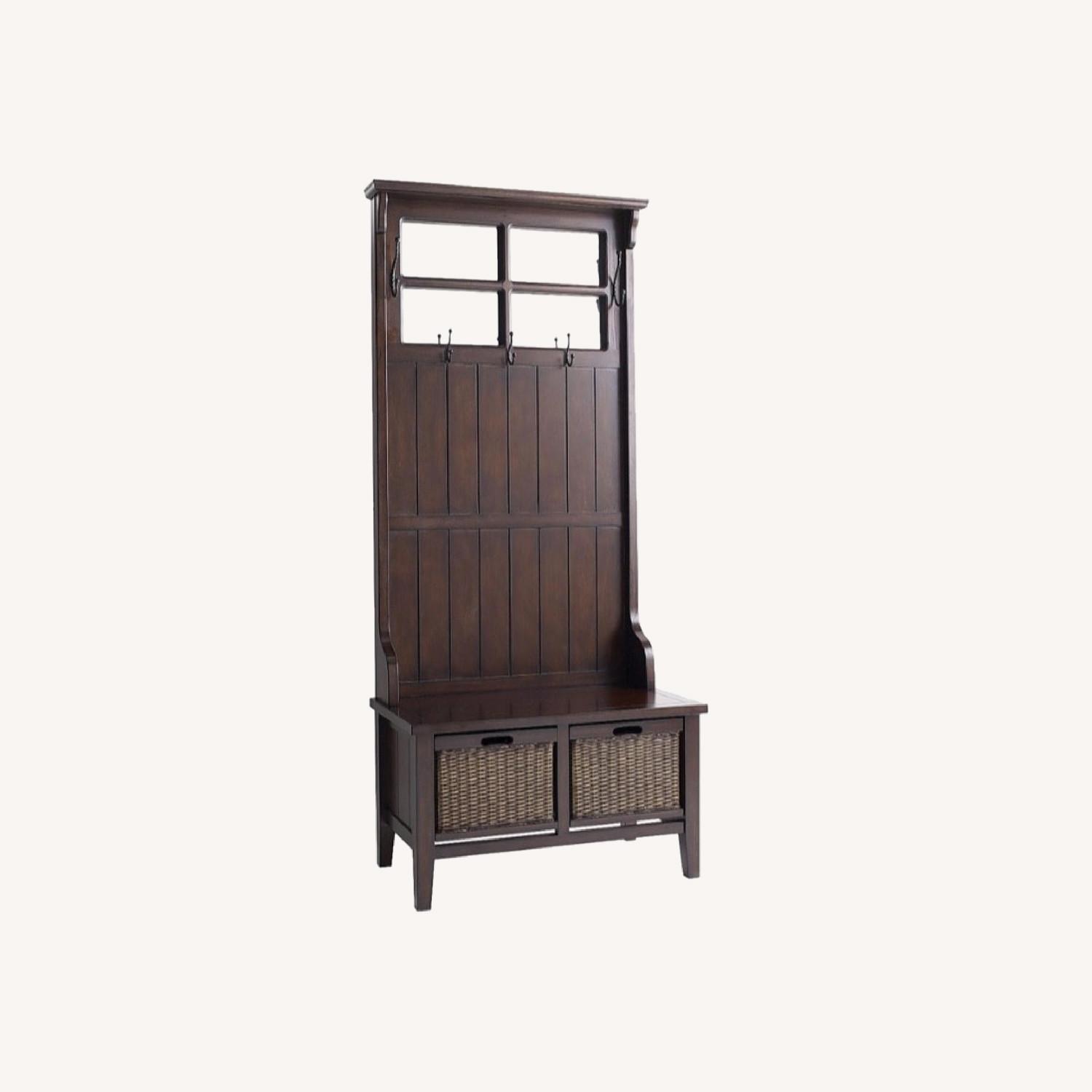 Coat-check, please. Keep jackets, shoes and backpacks contained thanks to this versatile pine storage piece. The built-in bench invites you to take a seat when fastening footwear, while sturdy hooks and rattan baskets hold scarves, gloves or dog leashes. There are even mirrors for a fast hair check. Whew. Who knew organizing could be so quick and easy?