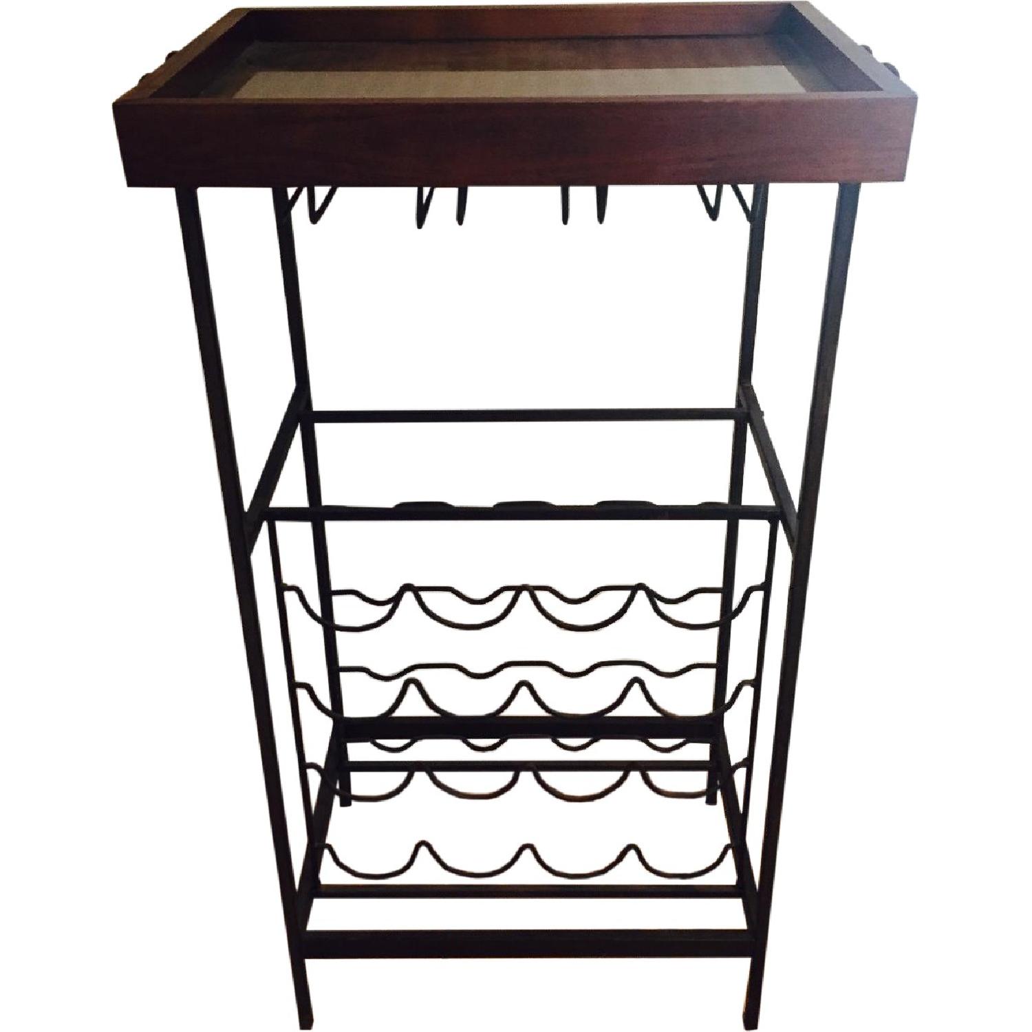 Seller's Notes:Metal bar table with removable tray (wood with rattan bottom and glass top and metal handles), another shelf, 16 wine bottle sections, four rows to store wine glasses. If you are handy and can attach castors, it would be an excellent bar cart. It is 36" tall, 22" wide with handles (20" without) and 15" deep.