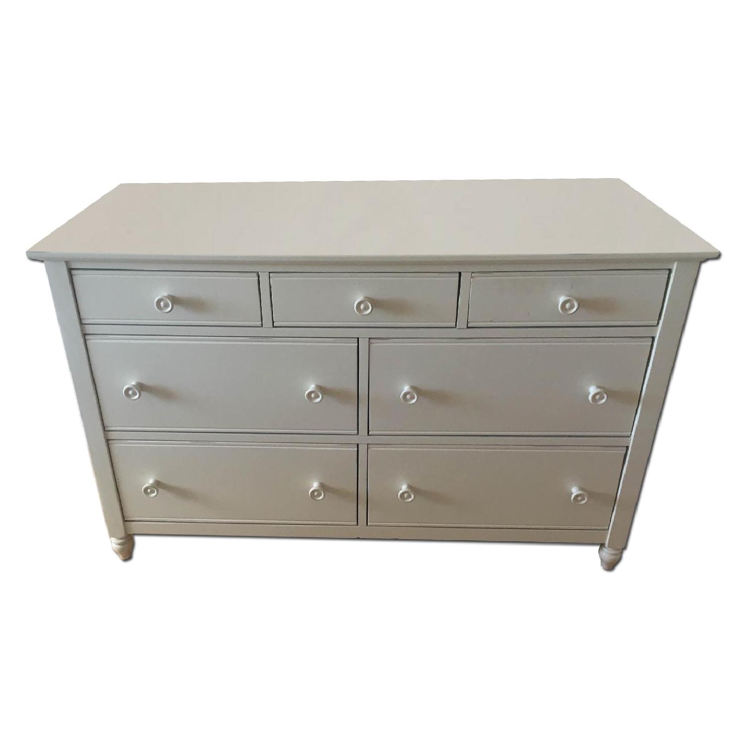 Seller's Notes:Dresser from Pier 1 Imports Cottage Collection. "Antique White"-- a soft white with a faint distressed finish for a cozy rustic style. Three smaller drawers at top and 4 larger drawers at middle and bottom. Bead board detailing at sides. Crown molding, scalloped aprons, sheraton legs. I absolutely love this dresser it just will not fit in my new apartment. Stores a lot due to its wide dimensions. Please see my listing for a matching nightstand!