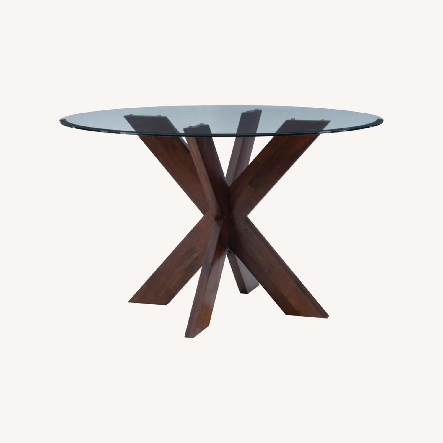 Seller's Notes:Good condition except some minor blemishes on glass due to adhesive cushion bumper placed between glass & wood base - easily cleaned w some goo gone or spray. Some minor scratches on base - not noticeable w naked eye. View my other listings for dining chairs set.