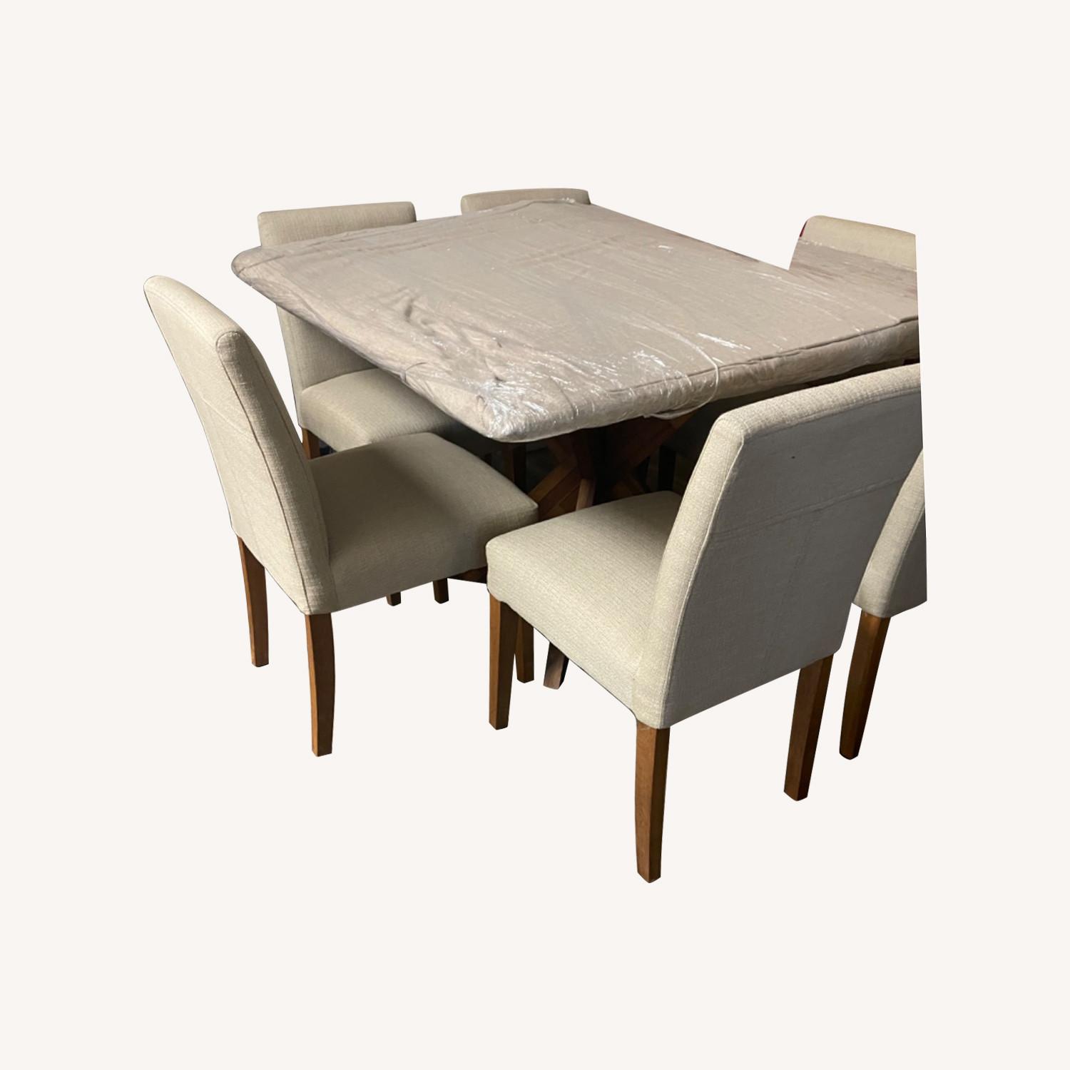 Seller's Notes:Purchased from Pier 1 Imports, this dining room treasure is made from acacia wood and includes a square glass top with 6 upholstered chairs in a Flax colored fabric. Also included in this set is a matching console cabinet with one removable and adjustable shelf and 2 sliding glass doors. All items are in excellent conditions. Dimensions: Glass Top 4’ x 4’ Base 30” H