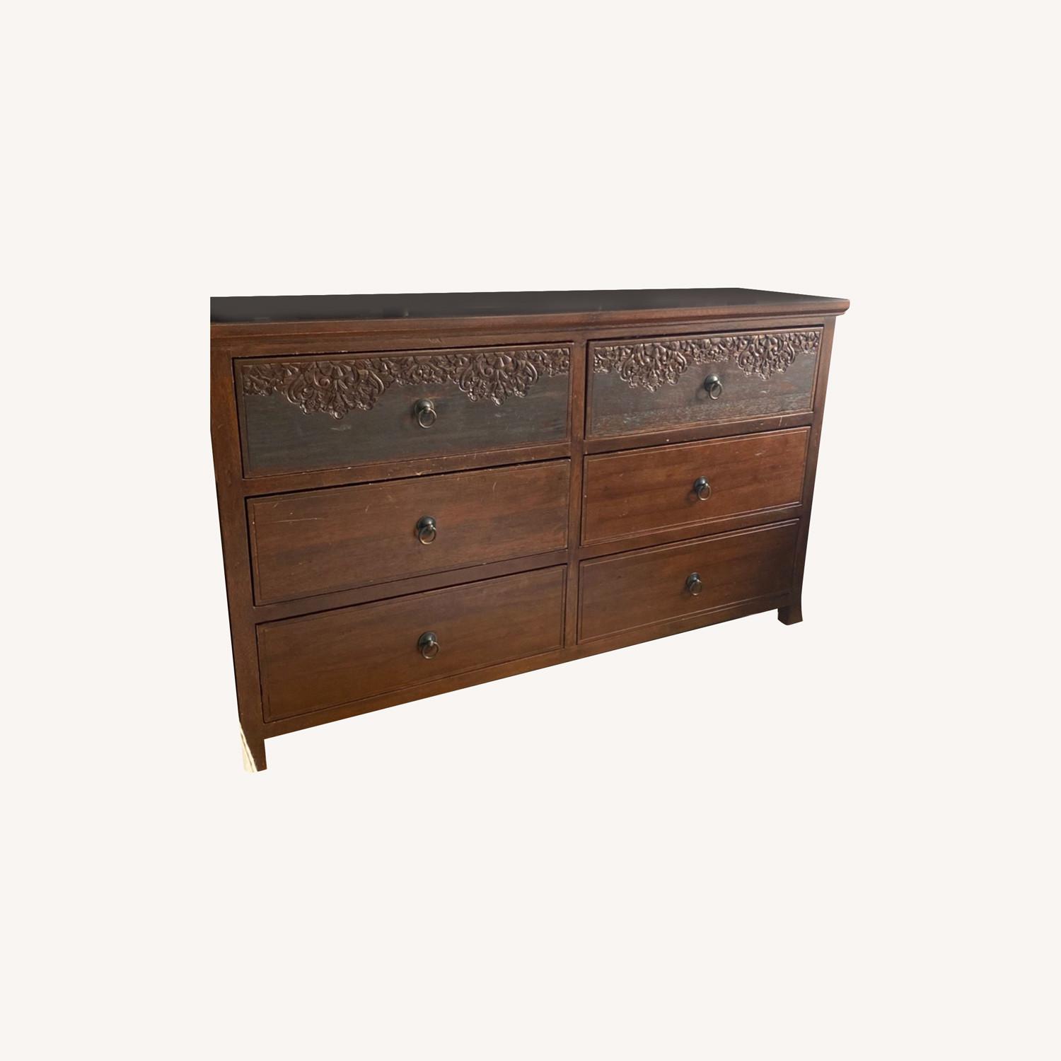 Seller's Notes:Beautiful Balinese solid wood dresser from Pier 1 Imports. Top two drawers have felt lining. Great storage! Big drawers. A few slight scratches on the front, but otherwise great piece!