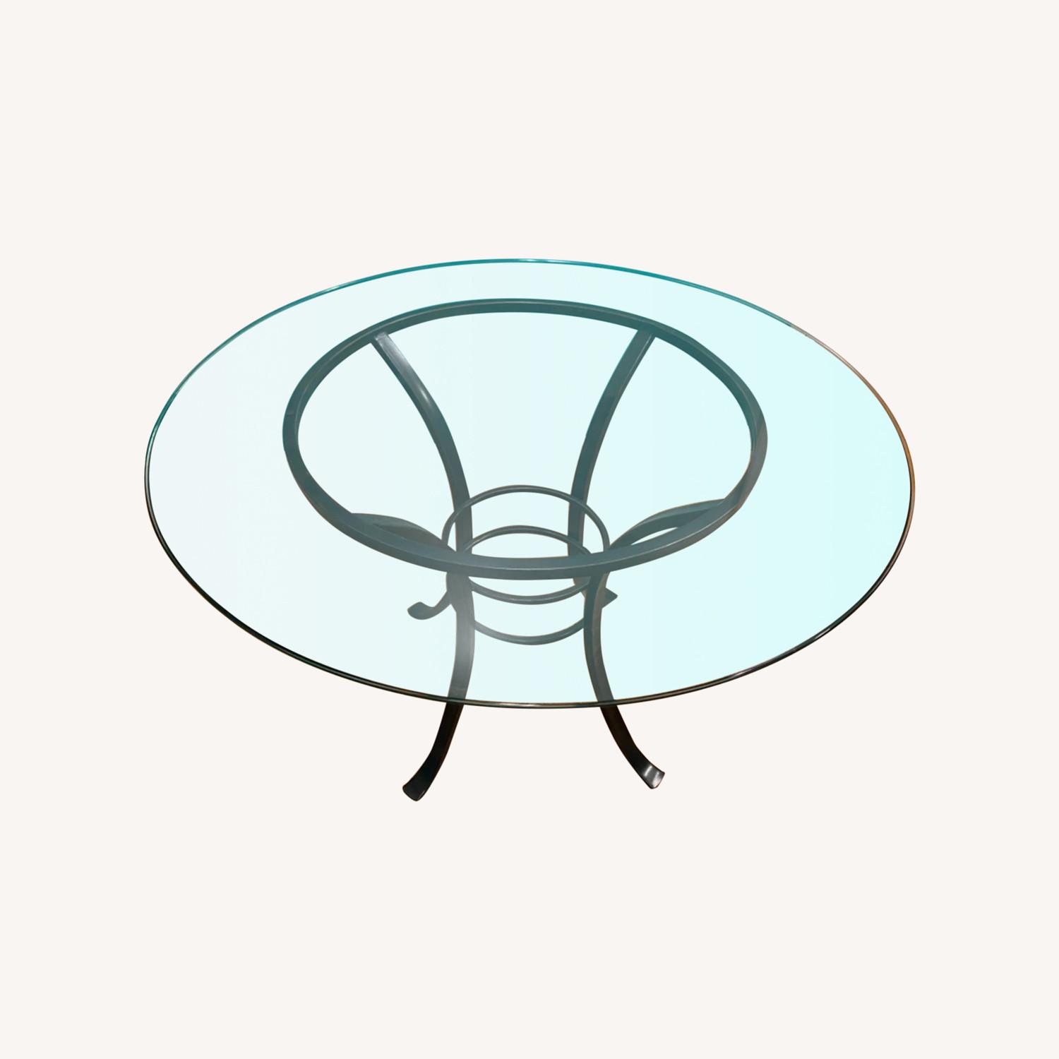 Seller's Notes:Glass dining table for 4 in excellent condition! Base is cast iron, black-coated. Very sturdy with no blemish upon inspection. 30” tall Glass top is intact with smooth edging all the way around. One visible hairline scratch (pictured), barely noticeable unless the light hits it in a specific way. 42” diameter. Discontinued item from Pier 1 Imports under previous management. This table was used indoors, but is sturdy enough for outdoor set-ups as well! AD21