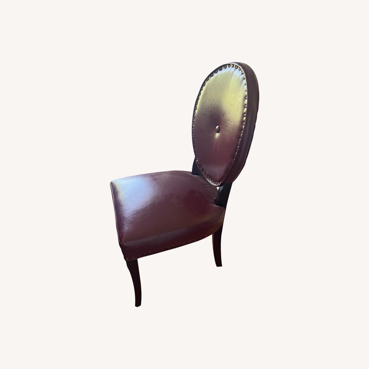 Seller's Notes:Pier 1 purchased, 3 in Excellent condition no visible issues, one chair has cracking on side seat but otherwise fine all around. Deep red burgundy color with vintage brass button accents and dark wood stain legs.