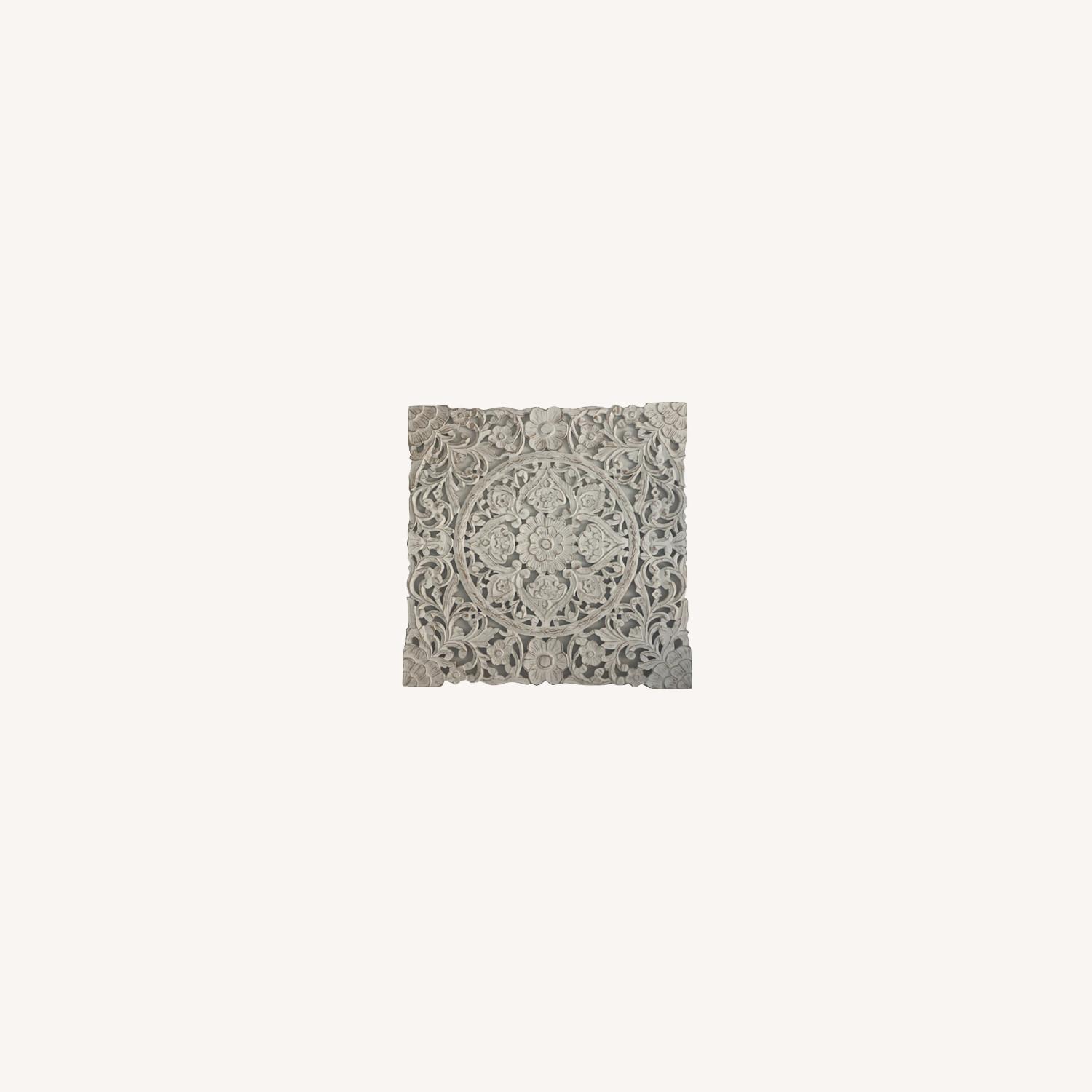 Seller's Notes:Stunning center flower surrounded by cutout medallion-like designs that resemble hand-carved detailing. Painted and distressed composite wood. Like-new condition and has hooks on back for easy mounting.
