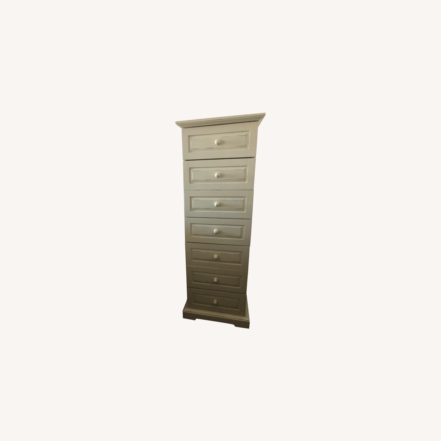 Seller's Notes:Beachy-style tall dresser, perfect for apartments with a tight squeeze! Overall good condition, with normal wear and tear. Discoloration on the top, as shown in photo. Drawers all work.