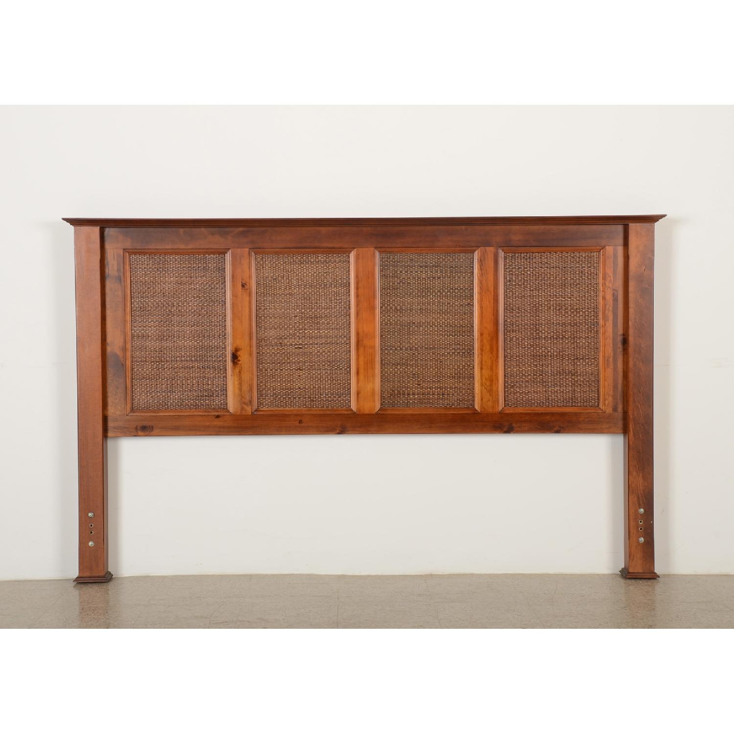 Seller's Notes:Indonesian headboard and footboard with rattan panels, pine with walnut finish, originally purchased from Pier One. Body is custom-made platform, captain's bed style with four large storage drawers, made of ceiba hardwood, made to match and fit the headboard and footboard. Bed has very minor signs of wear, mainly along the edges as you can see in photo 4. The bed is currently disassembled for moving. The first photo is a manufacturer's photo of the headboard. The others are of the footboard (with the headboard wrapped in paper behind it). Headboard and footboard are 81" wide. Headboard is 49.25" high and footboard is 36.5" high. Footboard and headboard are exactly the same except the footboard has shorter legs.