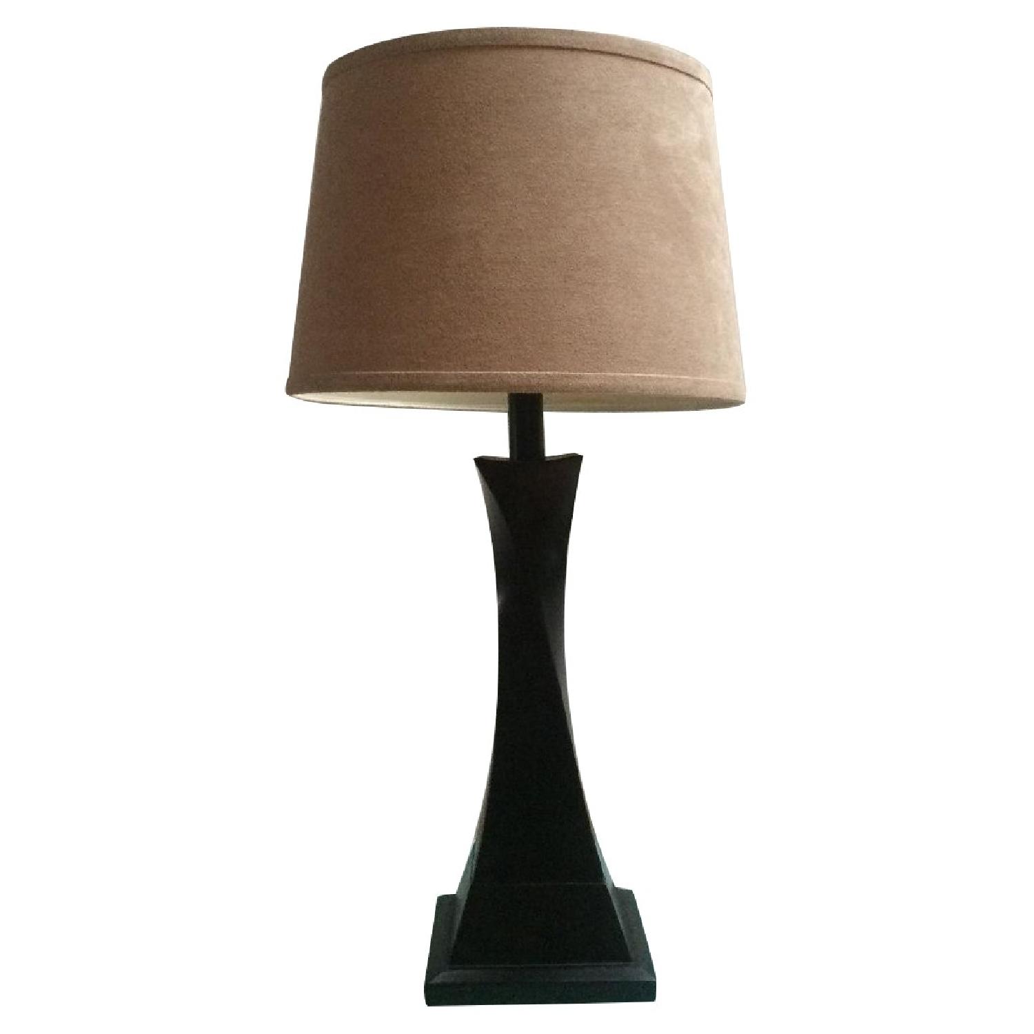 Seller's Notes:Great contemporary wooden lamp base, with tan microsuede shade