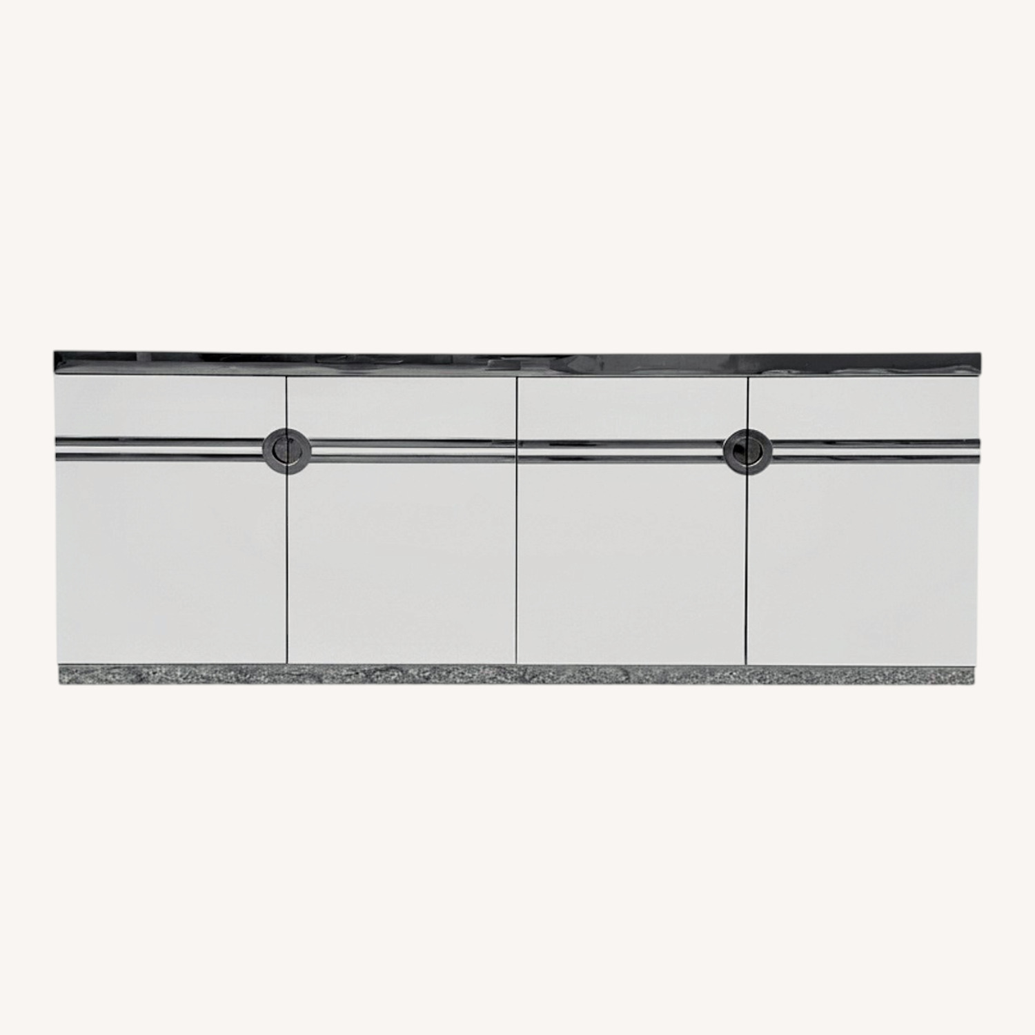 Seller's Notes:Sleek and sophisticated 1970s design by Pierre Cardin, this long, low white cabinet has linear graphic elements and recessed pulls in chrome. The piece references art deco design, but is decidedly modern. Four doors conceal two cabinets each with three drawers.