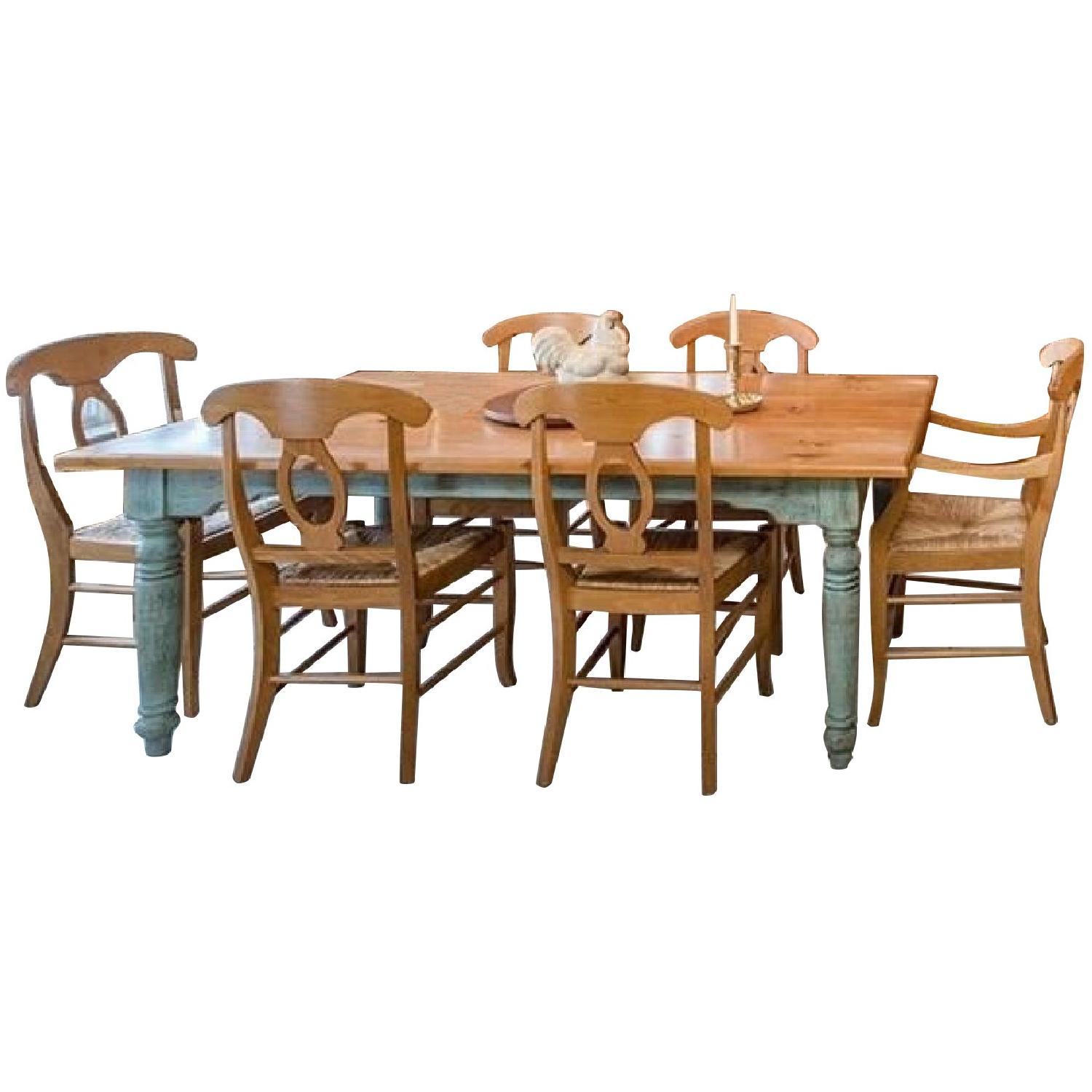 Seller's Notes:The pine top has a natural finish with intentional distress marks (there are a few minor scratches and a few worn spots. The base and legs have a light green wash finish and are in perfect shape. The length of the table is 77". I absolutely love this table, but we are moving and it will not fit in the eat in kitchen. I also have six Pottery Barn chairs that match very nicely which are listed separately on this site (they are in mint condition).