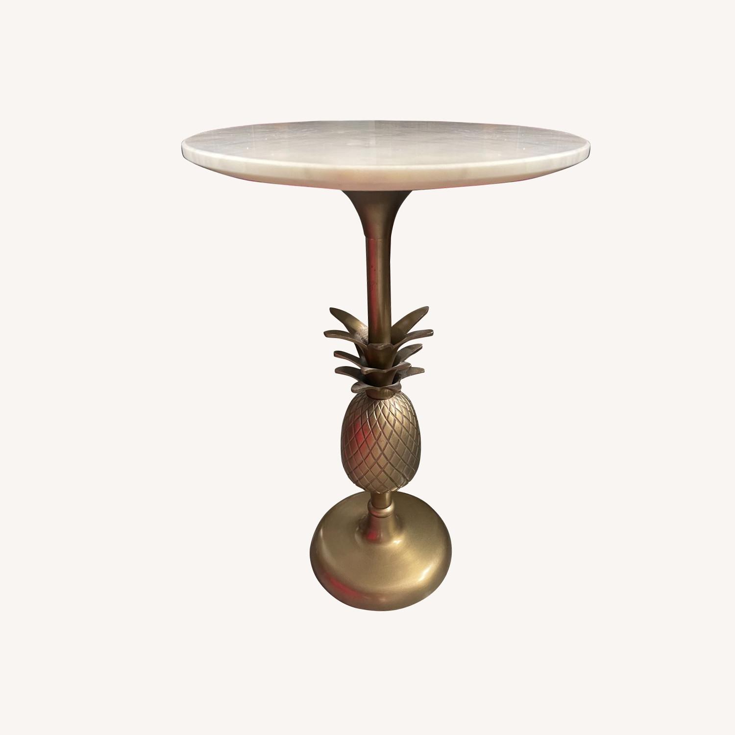 Seller's Notes:Brass side table with white marble top Polished marble has a wax seal. Dusting is best done with a soft, dry, lint-free cloth. This piece is intended for indoor use Dimensions 21"H, 14" diameter 20.5" under table clearance 0.5" tabletop thickness 13.5 lbs.