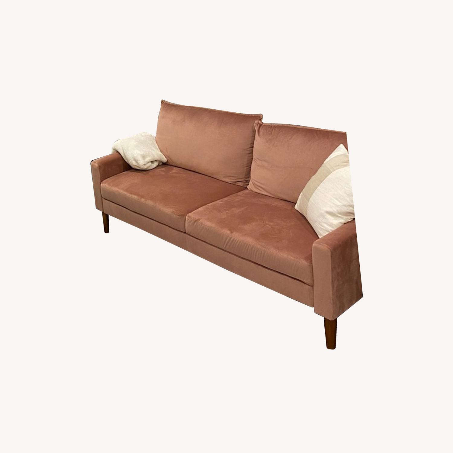 Seller's Notes:Sad to see this couch go. We just moved and it doesn't fit in our new place. It's soft and cozy and the pink brightens up a room.