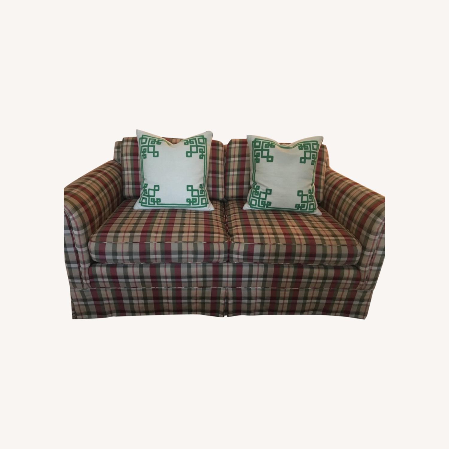 Seller's Notes:Comfortable and beautiful loveseat covered in handsome plaid. Two Pottery Barn pillows included. Very good condition.