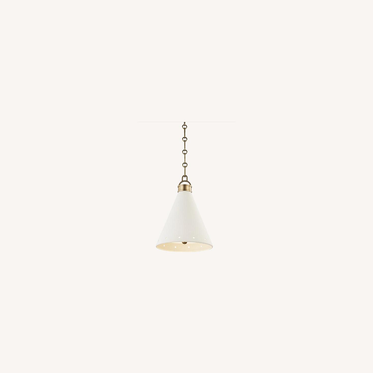 Seller's Notes:2 brand new Plaster No. 1 Pendants. We had our builders hang these and then ended up changing the floor plan in this area and no longer have a great use for thsee despite loving them. Classic and modern at the same time, this cone-shaped pendant is sure to become a fast favorite styled over your kitchen island or nook. Circle cutouts line the rim of its steel shade to add a touch of dimension to the simple form, while aged brass details complete the design with an elegant touch. • Width/Diameter:10" • Height: 13" • Backplate/Canopy/Base: 4.75" • Shade Material: Plaster over steel • Wattage 75w ea. • Socket Type E26 Medium Base - A19 Bulb • Plug In: No Note: will sell both for $800 inclusive of shipping