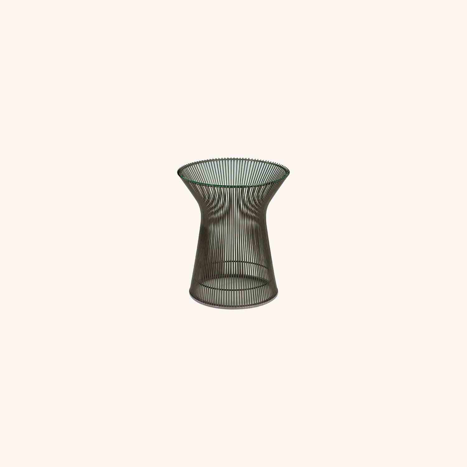 Seller's Notes:Platner Side Table with glass top and metallic bronze base. In good condition with small chip on the underside of the glass top and very minor scratches on the top. The metallic bronze finish on the base has aged a little but it still looks very good. H 18" W 15.75" D 15.75"