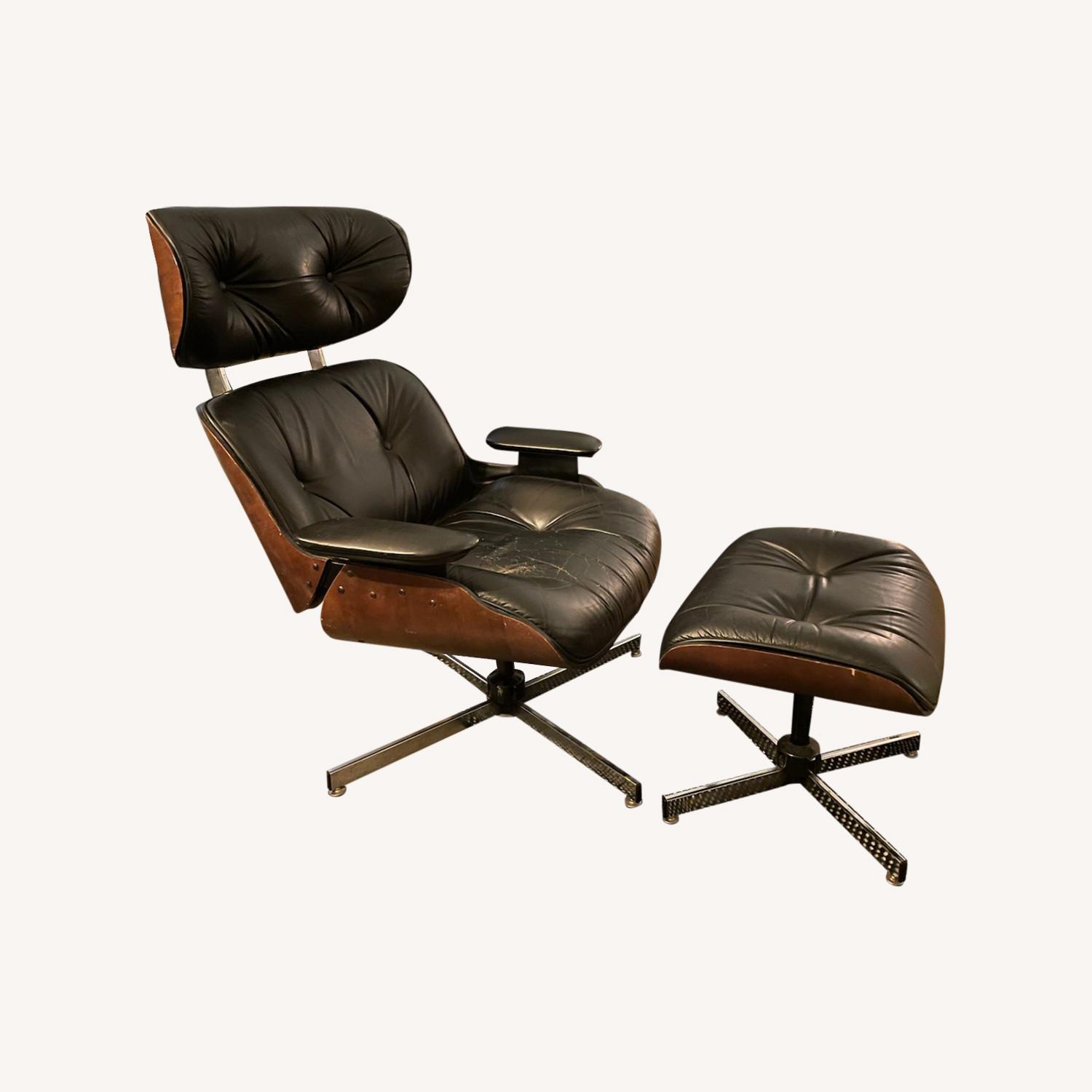 Seller's Notes:Mid-Century Modern design Classic Plycraft lounge chair and ottoman in black with walnut veneer. A tribute to the Eames style in pre-loved vintage condition. These chairs were made by Plycraft in the late 60s - late 70s. These chairs are taller and wider than the original Eames which many people find more comfortable, plus they recline and swivel! The chrome base have four prongs each with some oxidation marks, and there are a few nicks and dings in the plywood. The original black upholstery has several scratches primarily in the seat, which add to the vintage beauty and showcase how pre-loved this piece is. The recline in the chair is a bit wobbly, could use someone handy to tighten it! Chair measures about 31 1/2" wide x 31" deep x 39" tall (total footprint space) Ottoman measures about 21" wide x 16" deep x 16 1/2" tall