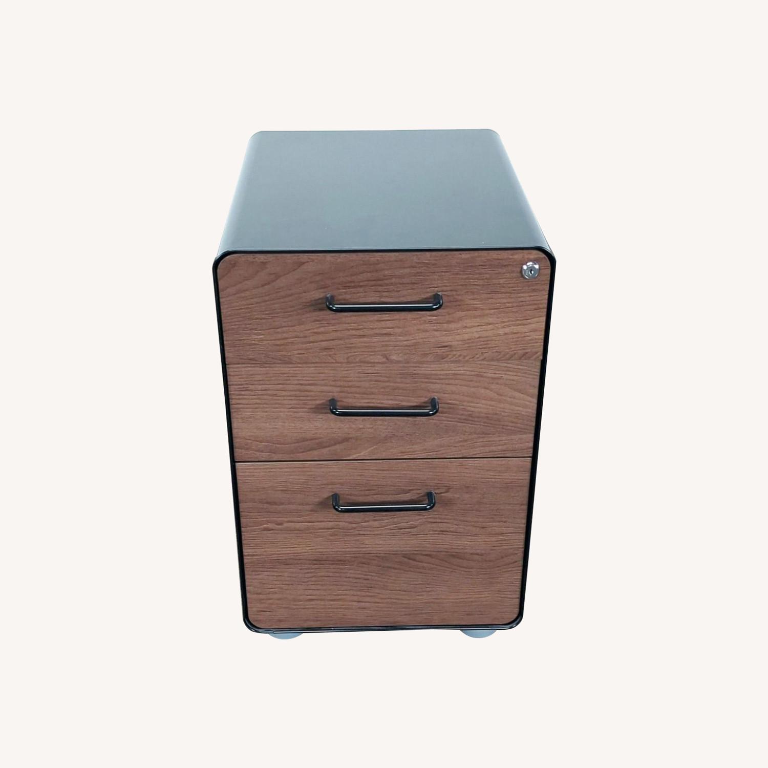 Seller's Notes:The cabinet features a powder-coated black steel frame with wood-grained laminate drawer fronts.