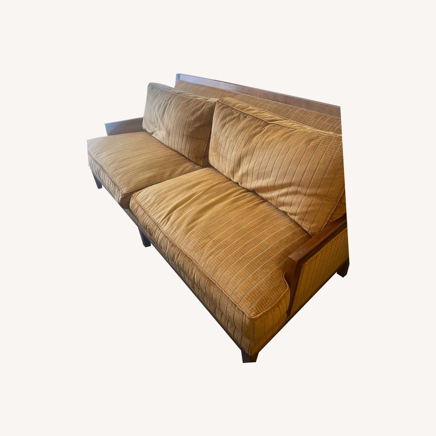 Seller's Notes:Gorgeous, velvet art deco orange couch with solid oak frame from the famous Porters of Racine furniture store. In excellent condition.