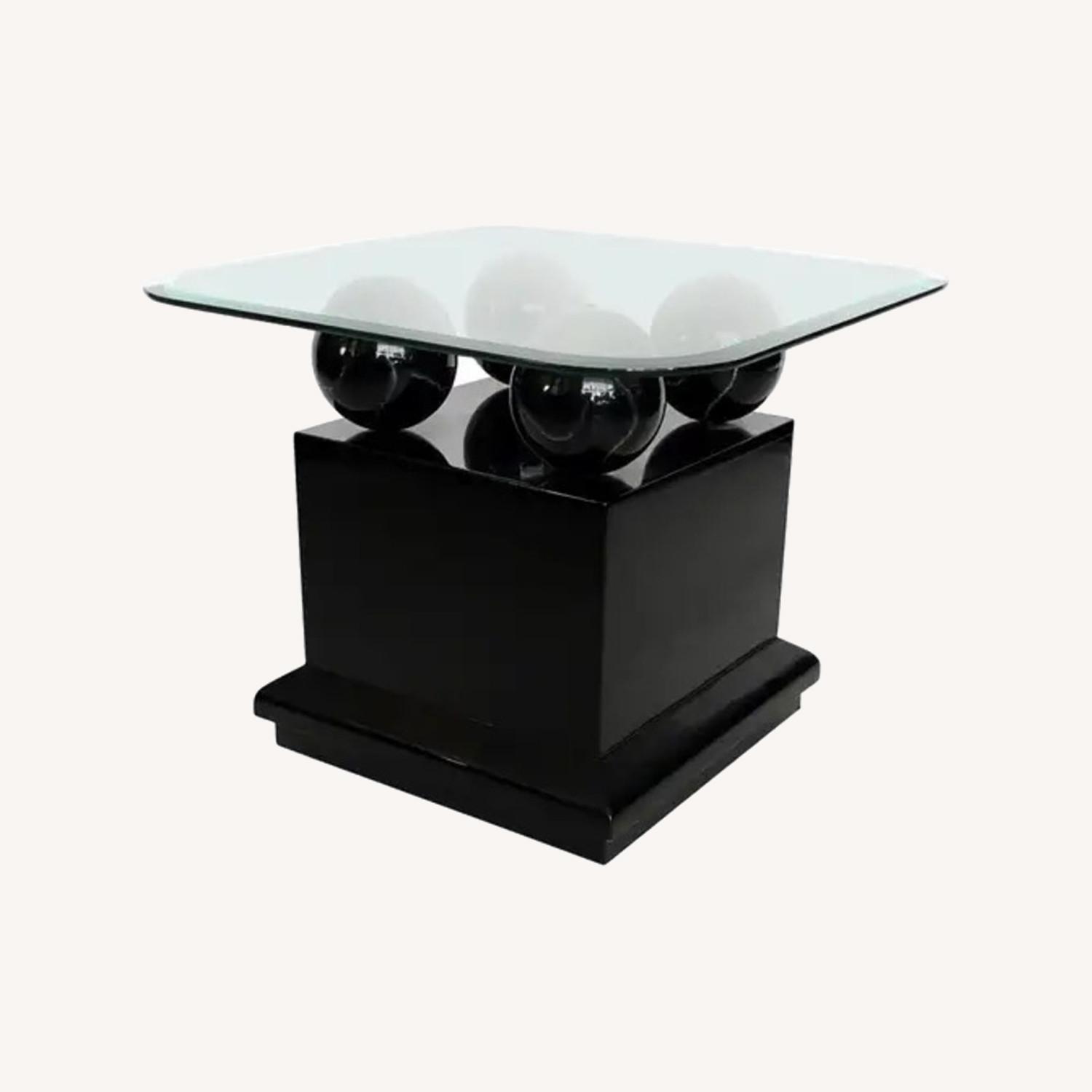 Seller's Notes:Postmodern styling stunning from every angle these side or end tables designed and created in the 1980s. Freshly black lacquered bases with four faux black marble spheres that support beveled glass tops with soft rounded edges. These will easily fit into many interiors. Each table with glass top measures: H 21 in. x W 26 in. x D 26 in. Each table without glass top measures: H 20.75 in. x W 18.75 in. x D 18.75 in. * Period: 1980-1989 * Date of Manufacture: circa 1980s * Condition: Good. Wear consistent with age and use. The glass tops are original, have minor scratches from years of normal use.
