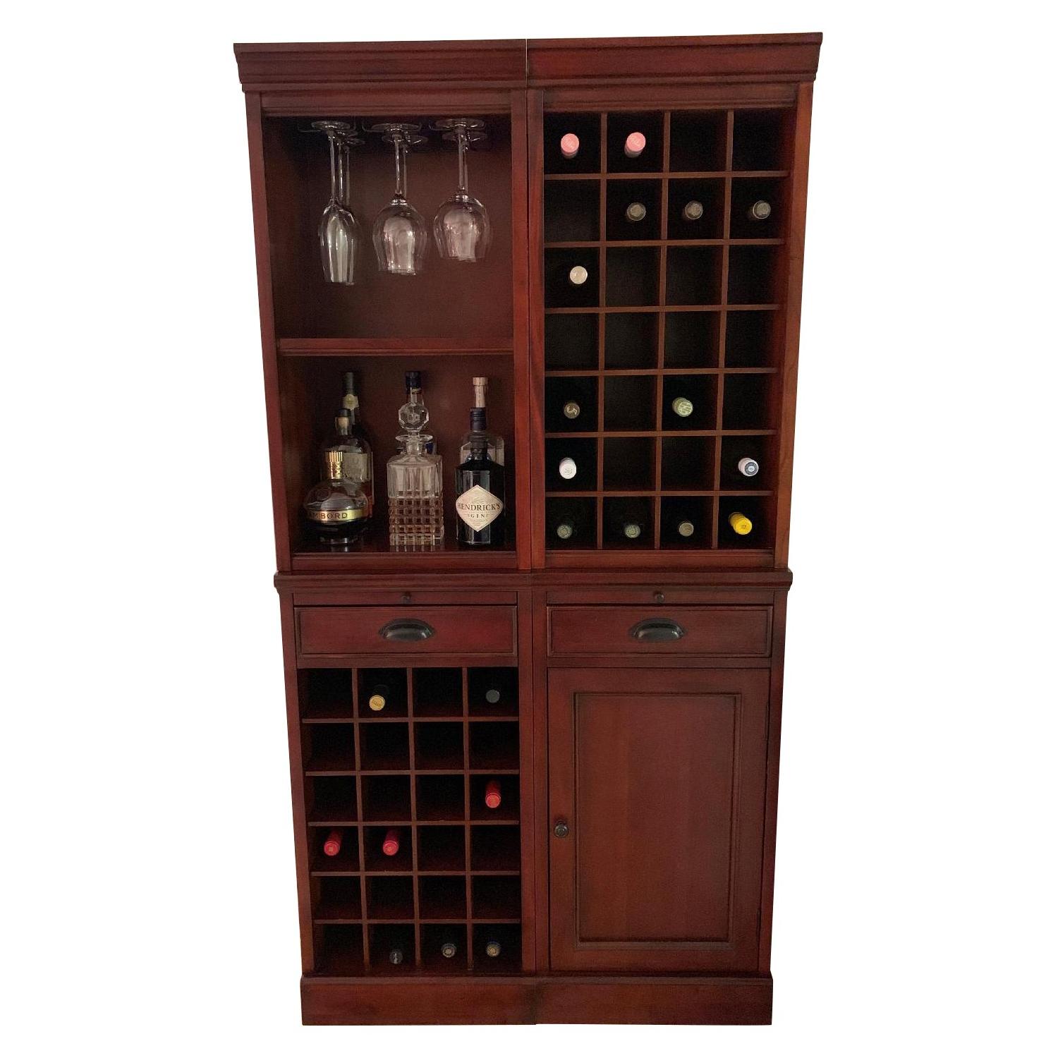 Seller's Notes:Pottery Barn Modular Bar with Wine Grid Tower and Cabinet Tower in Mahogany Stain. Two pieces that can be hooked together or kept separate. Four years old in excellent condition. Bar holds a total of 48 bottles of wine. Original Price $1,267 Modular Bar with Wine Grid Tower (left side) Overall: 18" wide x 13.5" deep x 36" high https://www.potterybarn.com/products/modular-bar-tower/?pkey=cbars-furniture&isx=0.0.1864 Modular Bar with Cabinet Tower (right side) Overall: 18" wide x 13.5" deep x 36" high https://www.potterybarn.com/products/modular-bar-cabinet-tower/?pkey=cbars-furniture&isx=0.0.2052