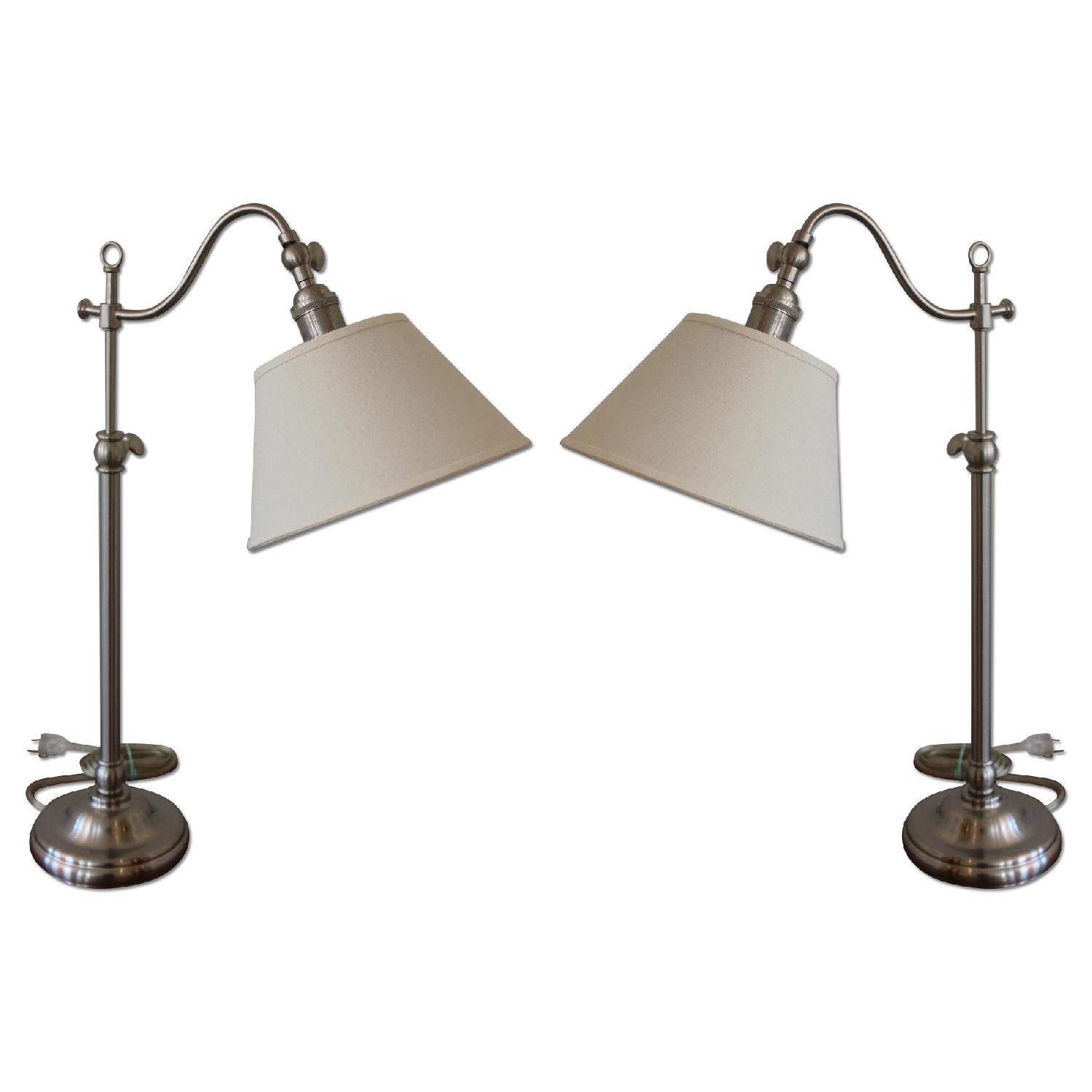 Seller's Notes:Pottery Barn Adair Bedside Lamp Set of 2 http://www.potterybarn.com/products/adair-bedside-lamp/ New set of 2 sells for $198 Felt protective bottom. Adjust height and angle with the turnkey. White linen shade is included. Overall: 15.5" wide x 9" deep x 20.5" high; adjusts to 24" high Lamp: 11" wide x 6" deep x 20.5" high; adjusts to 24" high Shade: 9" diameter, 5" high Cord: 5' long Bulb: 60 watts, type A (not included)