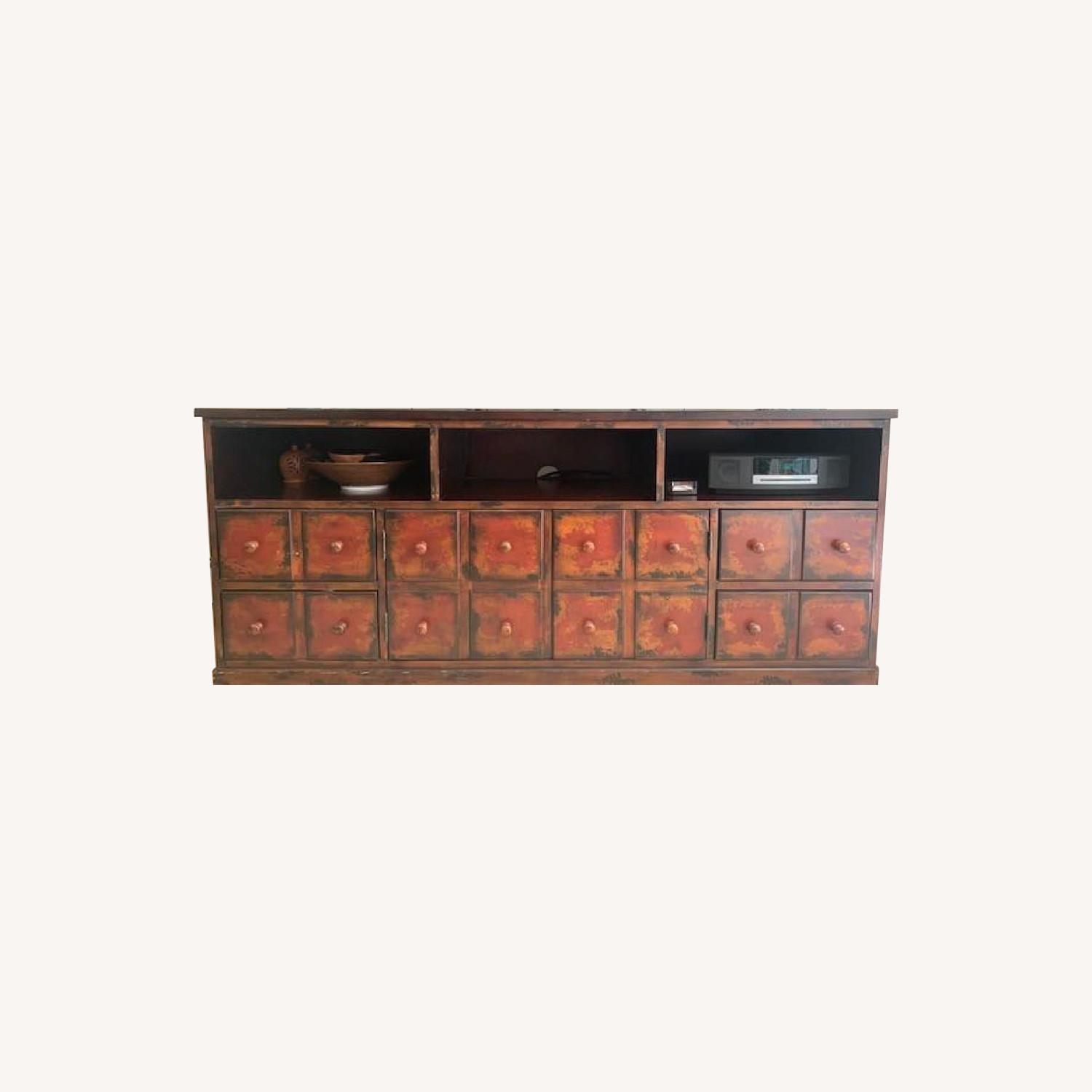 Seller's Notes:Distressed, dark wood media console will bring warmth to any living room! We bought this piece from Pottery Barn a few years ago and it's been a perfect addition to our New York apartment -- a LOT of storage, extremely resilient to scratches, and a stylish look. Details from Pottery Barn: - Masterfully crafted with a kiln-dried solid hardwood frame with corner blocking for structural integrity. - Built from hardwood, birch veneers and MDF. - Drawers feature English Dovetail joinery. - Finished by hand using our exclusive technique of staining, chipping, distressing and sanding each layer before sealing with a protective lacquer. - Holds up to a 64" flat-screen TV. - Includes cord cutouts in back for wire management. - Configured with 3 component cubbies, center cabinet with an adjustable shelf, and 4 drawers (2 on each side of the center). - Bluff-cut doors create the look of multiple smaller drawers. - Adjustable levelers provide stability on uneven surfaces. - Dimensions: 65" wide x 19.5" deep x 27" high Piece has very minor scratches that you'd have to look closely to see, and blend nicely into the distressed look. We are selling the piece to make space as we now have kids and are getting a bigger storage solution.