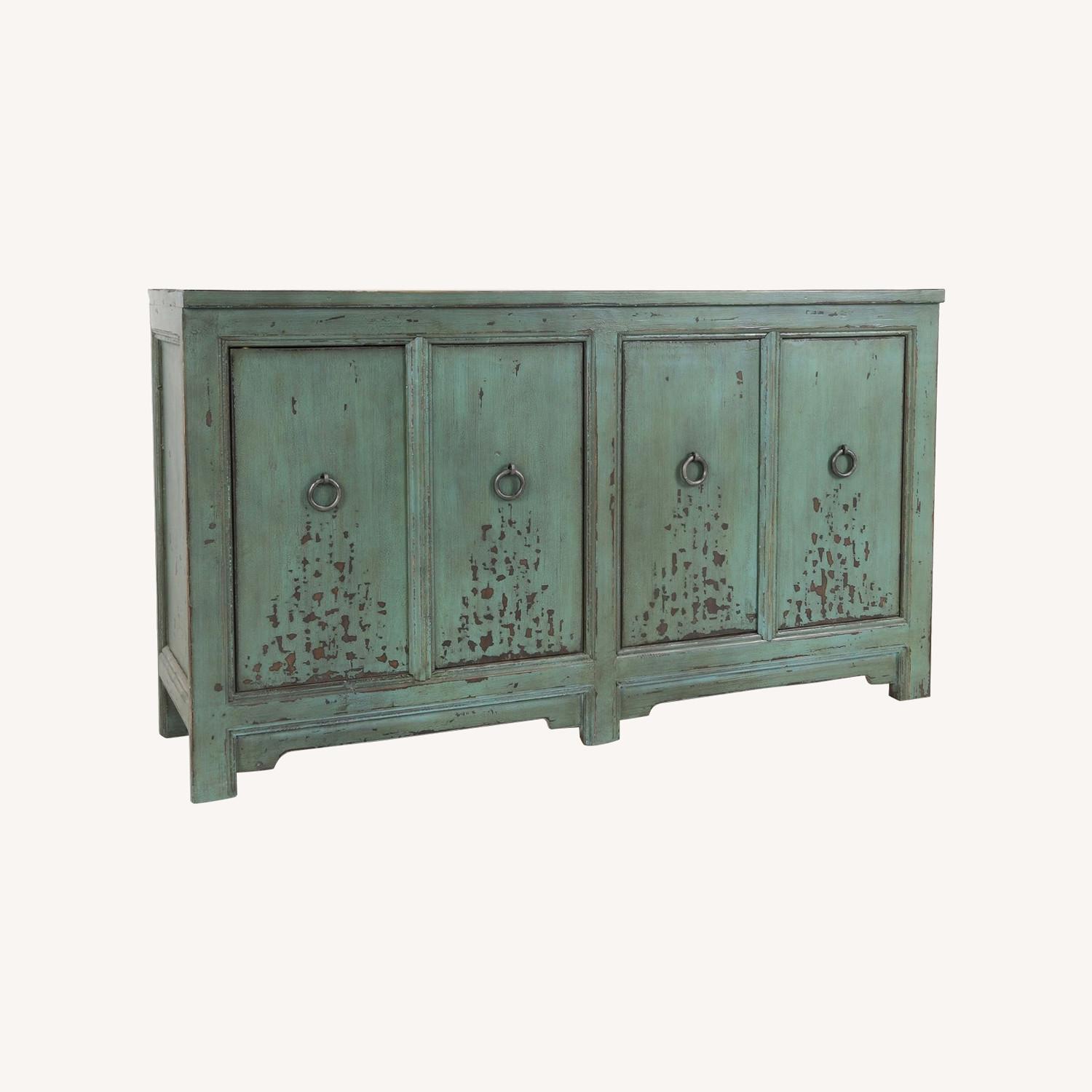 Seller's Notes:Made with reclaimed pine wood. Each piece tells stories from its previous life, including scratches, color variations, stains and natural imperfections. Crafted of pine, a gorgeous softwood with a closed grain pattern. Wood has a distressed hand finish in either Royal Blue, Antique Gray or Antiqued Green. Buffet is divided into 2 sections. Each compartment has 1 shelf. Anti-tip kit included: comes with safety-tested mounting hardware, instructions and a nylon strap. To prevent injuries from furniture tip-over, this item should be securely fixed to the wall. how to install anti-tip kits.