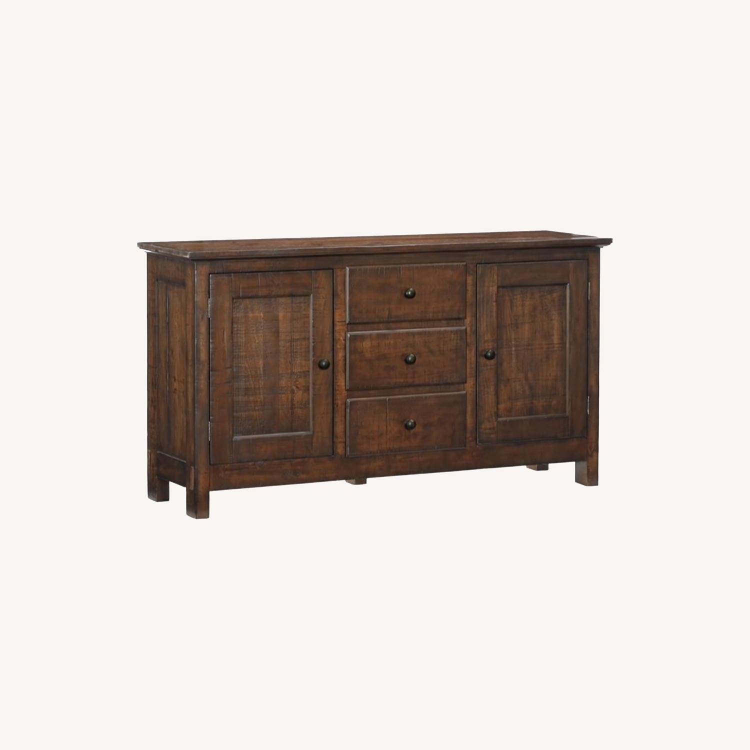 Seller's Notes:Overall: 66" wide x 19" deep x 36" high Top: 66" wide x 19" deep x 1.5" high Drawer Interior (3): 16" wide x 15" deep x 5.5" high Door (2): 18.5" wide x 26" high x 1" thick Knobs: 1.5" diameter Adjustable Shelf (4): 20.5" wide x 14" deep x 1" thick Cabinet Interior (without adjustable shelves): 20.5" wide x 16" deep x 26.5" high Clearance Under Buffet: 6.5"