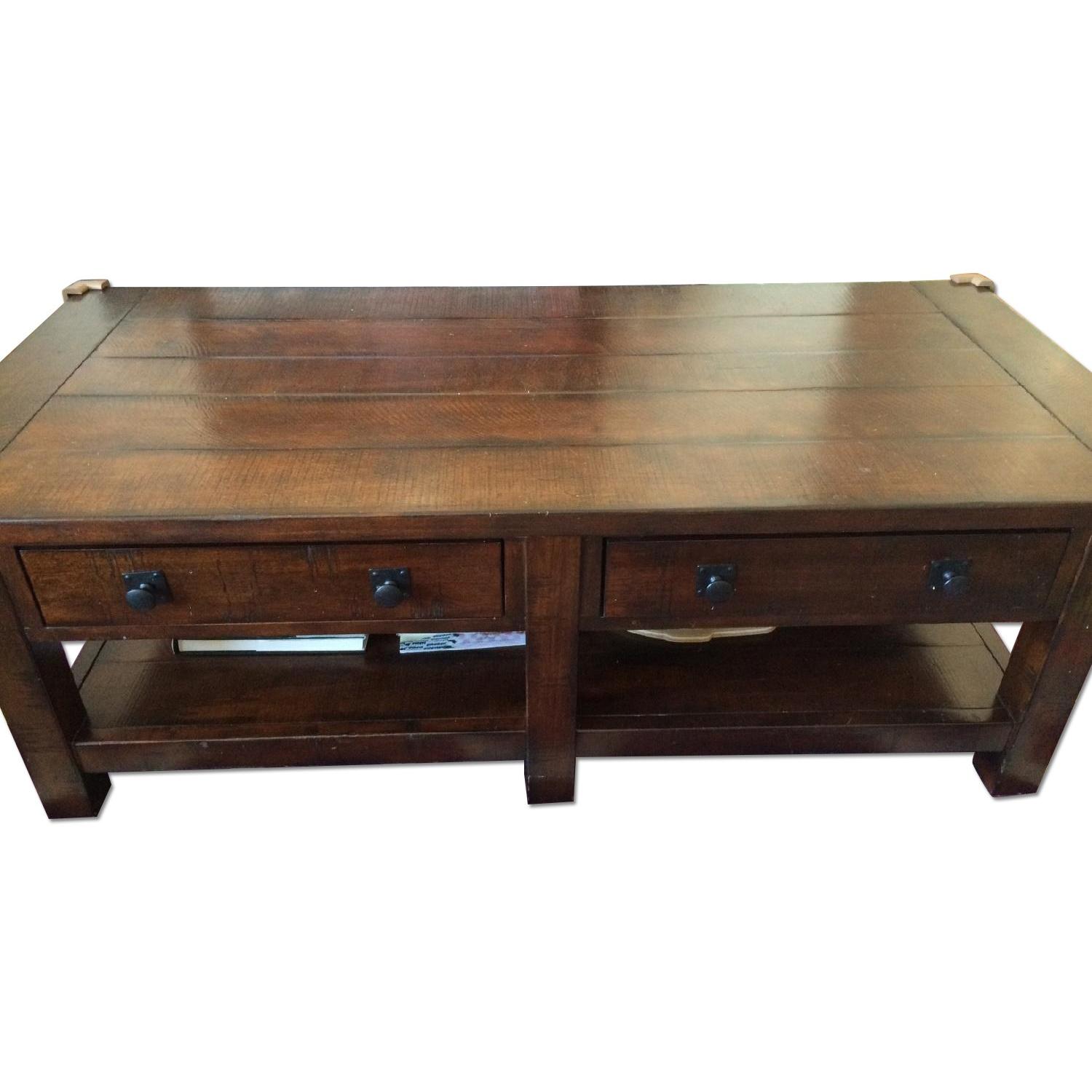 Seller's Notes:This is a beautiful table with great storage, as it has four drawers and additional storage underneath. We are moving and will no longer have room for it, so are hoping to find it a good home. Here is more info about it on the Pottery Barn website: http://www.potterybarn.com/products/benchwright-coffee-table/?pkey=ccoffee-side-console-tables%7Ccoffee-tables%7C& The protective child corners will be removed prior to pickup :)