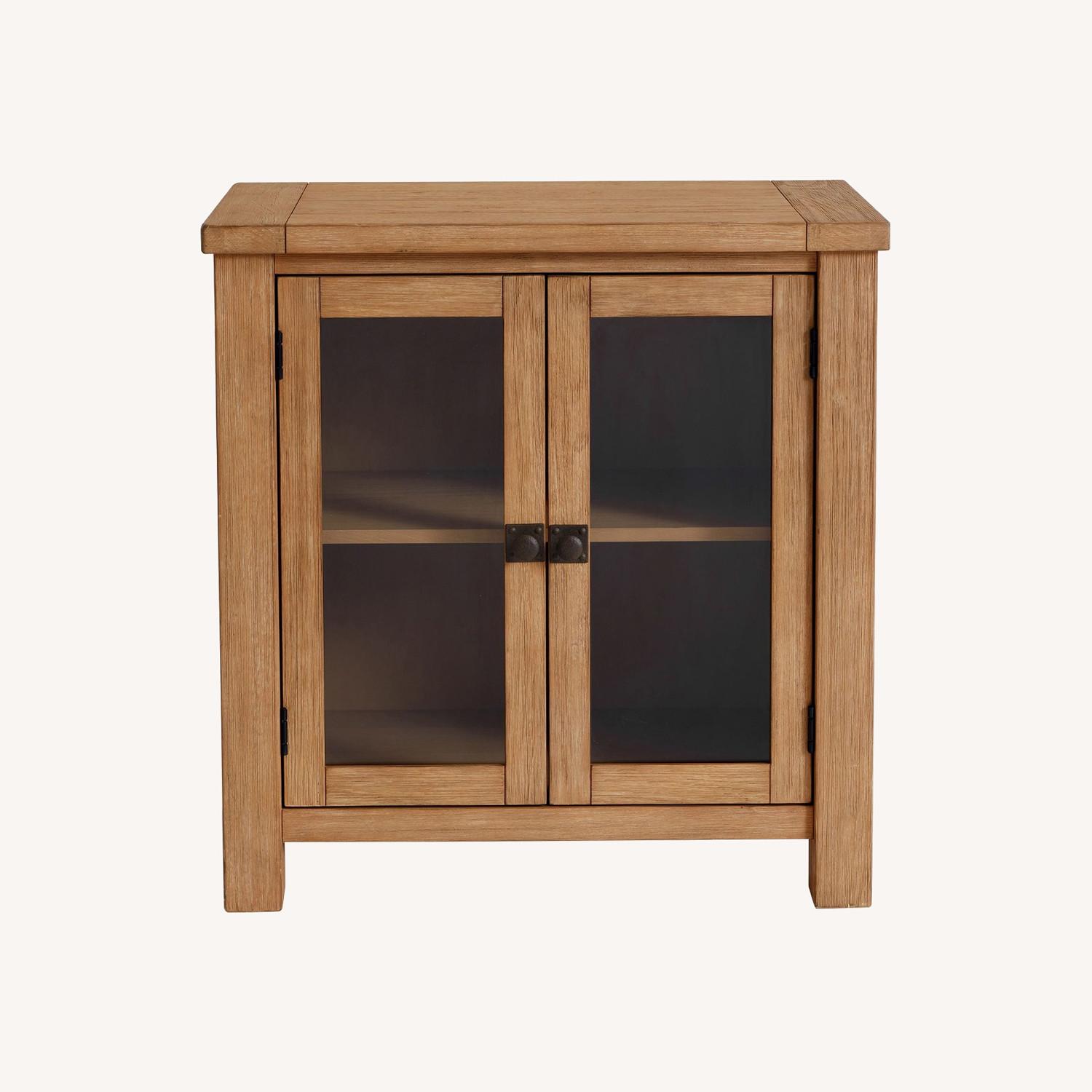 Seller's Notes:Storage cabinet features 2 glass doors and 1 adjustable shelf. Expertly crafted of solid spruce, spruce veneers and MDF and finished in Wax Pine. Kiln-dried wood helps prevent warping, splitting, cracking and developing mildew. MDF is an engineered wood that lends exceptional strength and ensures the product’s structural integrity over time. The use of veneers results in high-quality furniture with flawless surfaces and consistent color tones. Glass doors have tempered glass for safety. Adjustable levelers help with stability on uneven surfaces. Dust with soft, dry cloth. Imported.