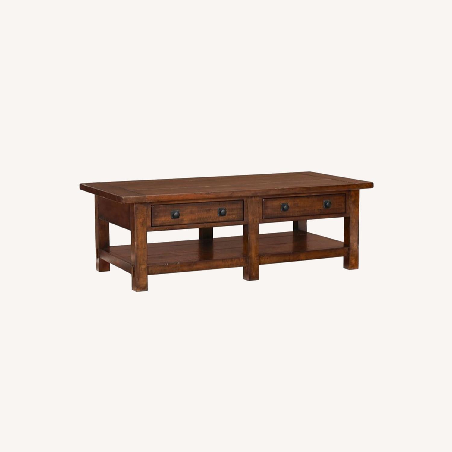 Seller's Notes:Inspired by an early 20th-century worktable that belonged to our designer’s great-grandfather, the Benchwright Collection honors the strength and simplicity of rustic-industrial design. This coffee table features two drawers and additional storage space below, statement hardware, and a hand-applied finish that highlights each intentional saw mark and groove across the wood’s naturally occurring grain. Expertly crafted of kiln-dried solid poplar and veneers. Two drawers with bronze-finished hardware pull out from either side. Finished by hand using our exclusive multi-step process that creates exceptional depth of color; available in Seadrift, Rustic Mahogany, Gray Wash, Tudor White or Blackened Oak finish. Features artisan-crafted details such as solid wood drawer boxes crafted with English dovetail joinery and smooth ball bearing glides. Kiln-dried wood helps prevent warping, splitting, cracking and developing mildew. The use of veneers results in high-quality furniture that has flawless surfaces and consistent color tones that will not be subject to cracking. Adjustable levelers help with stability on uneven surfaces. Overall: 54" wide x 26" deep x 18" high Top: 54" wide x 26" deep x 1.5" thick Apron: 5.5" high Drawer Interior (2): 18.5" wide x 21" deep x 3" high Shelf Interior (1): 48.5" wide x 23" deep x 6.5" high Clearance Under Table: 3" Distance Between Legs: 21" side to side; 19" front to back Top weight capacity: 150 pounds Shelf weight capacity: 300 pounds Drawer weight capacity: 16 pounds Weight: 98 pounds Packaging Dimensions & Weight: 58.5" wide x 29.5" deep x 21.5" high; 134 pounds