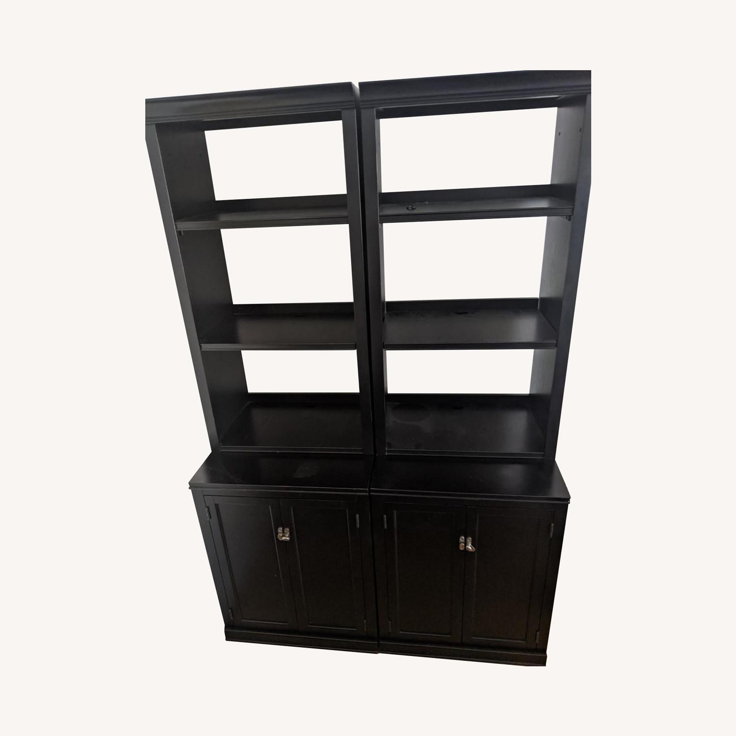 Seller's Notes:Pottery Barn Logan Double Bookcase. Black. Very heavy and sturdy. All hardware in perfect condition. There are drill holes between the shelves because they used to be attached. Will require 2 people to move. Comes apart into 4 large pieces for easy transport. Costs $2599 New. Must sell because we're moving.